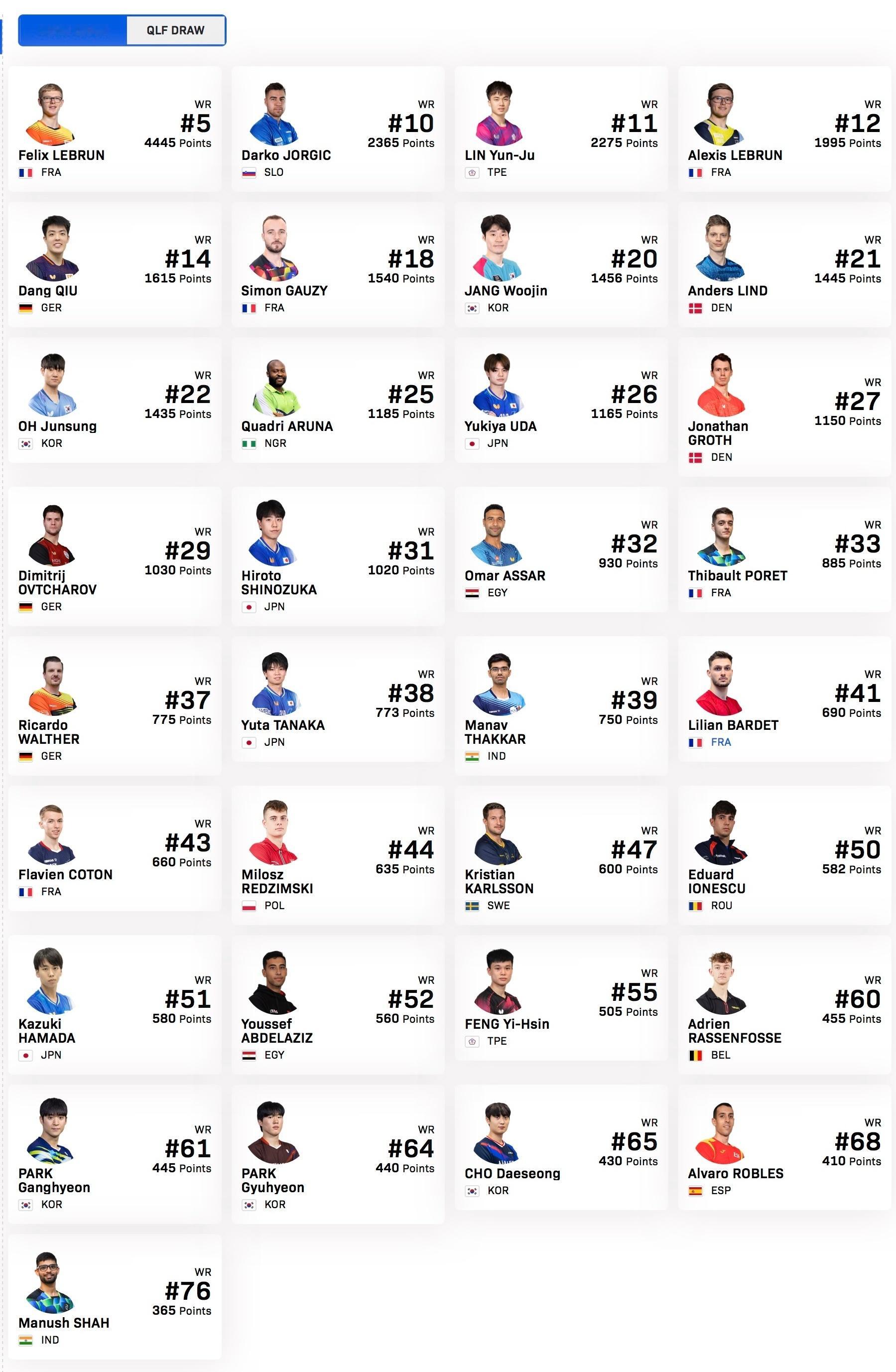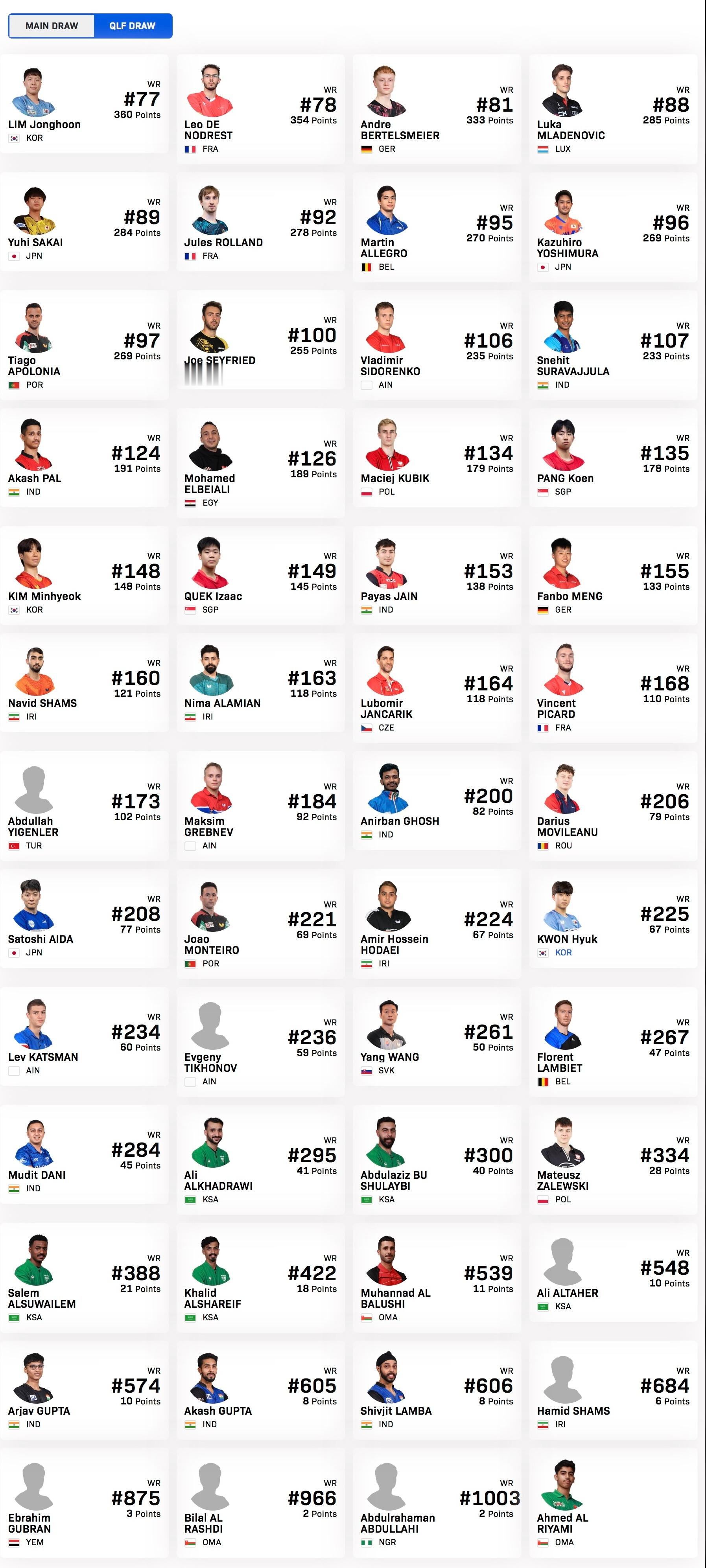 WTT球星挑战赛马斯喀特站【男单】参赛名单
