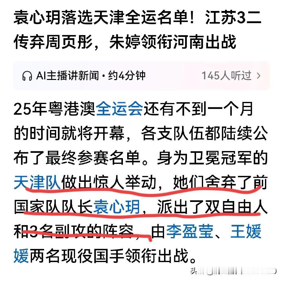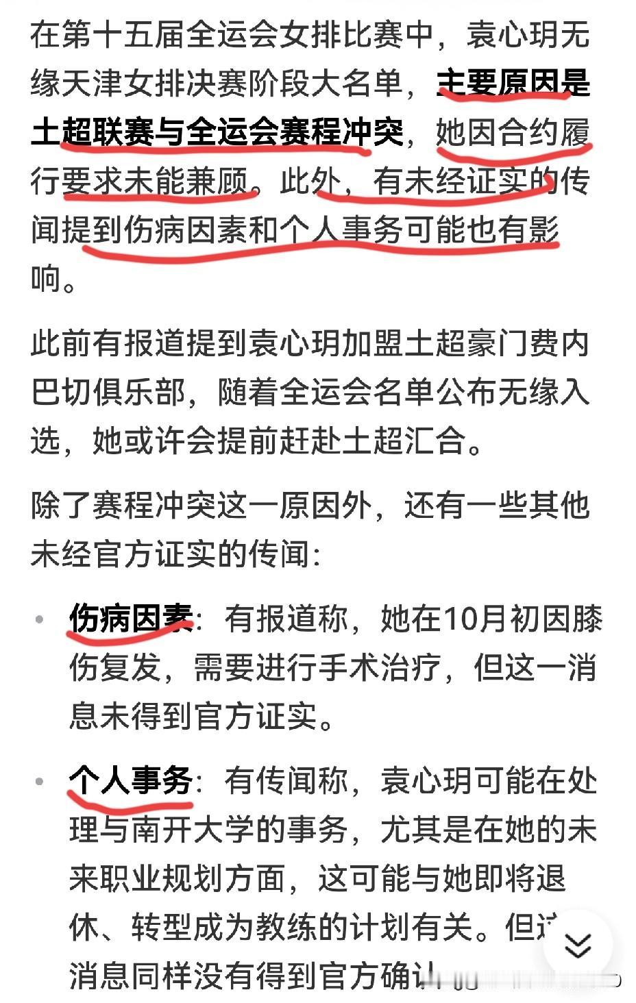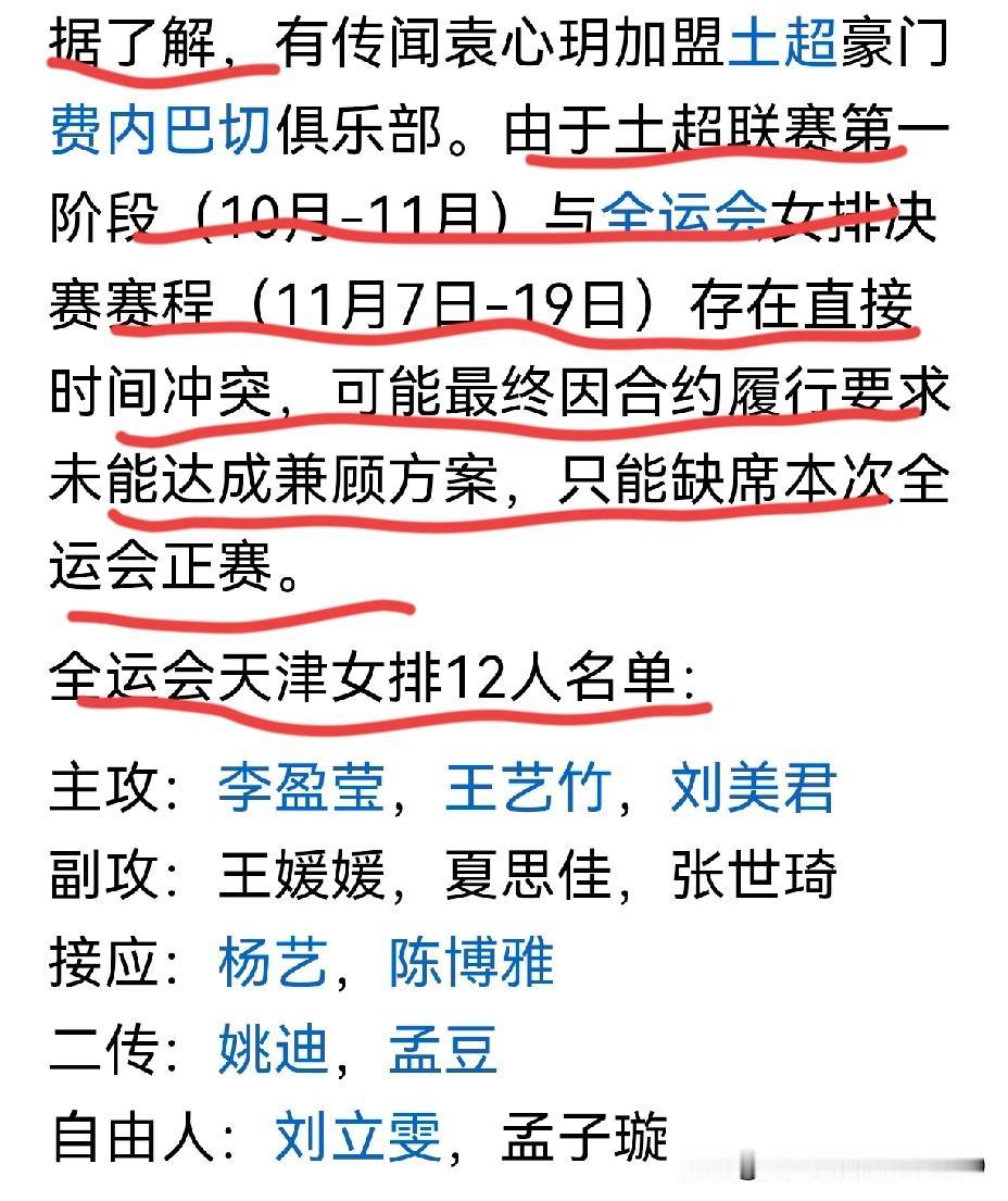 [玫瑰][玫瑰]袁心玥落选第15届全运会天津女排阵容,球迷纷纷找原因: 1,天津朱云发文说:谁在捣鬼?是某些人,某些部门针对天津女排的突然袭击!(见截图一) 2,是天津女排做出了惊人举动,对袁心玥选择了舍弃。(见截图二) 3,天津女排就袁心玥就代表天津女排参加全运会的具体事宜,双方未能答成一致。 4,土超截糊,土超联赛与全运会女排比赛的时间有冲突,不能兼顾,故选择缺席全运会。(见截图三) 5,有球迷认为:袁心玥代表天津女排参加全运会的资格审核没有被通过。 6,伤病原因。(见截图四) 7,个人事务方面的原因。(见截图四) 8,其他原因。
