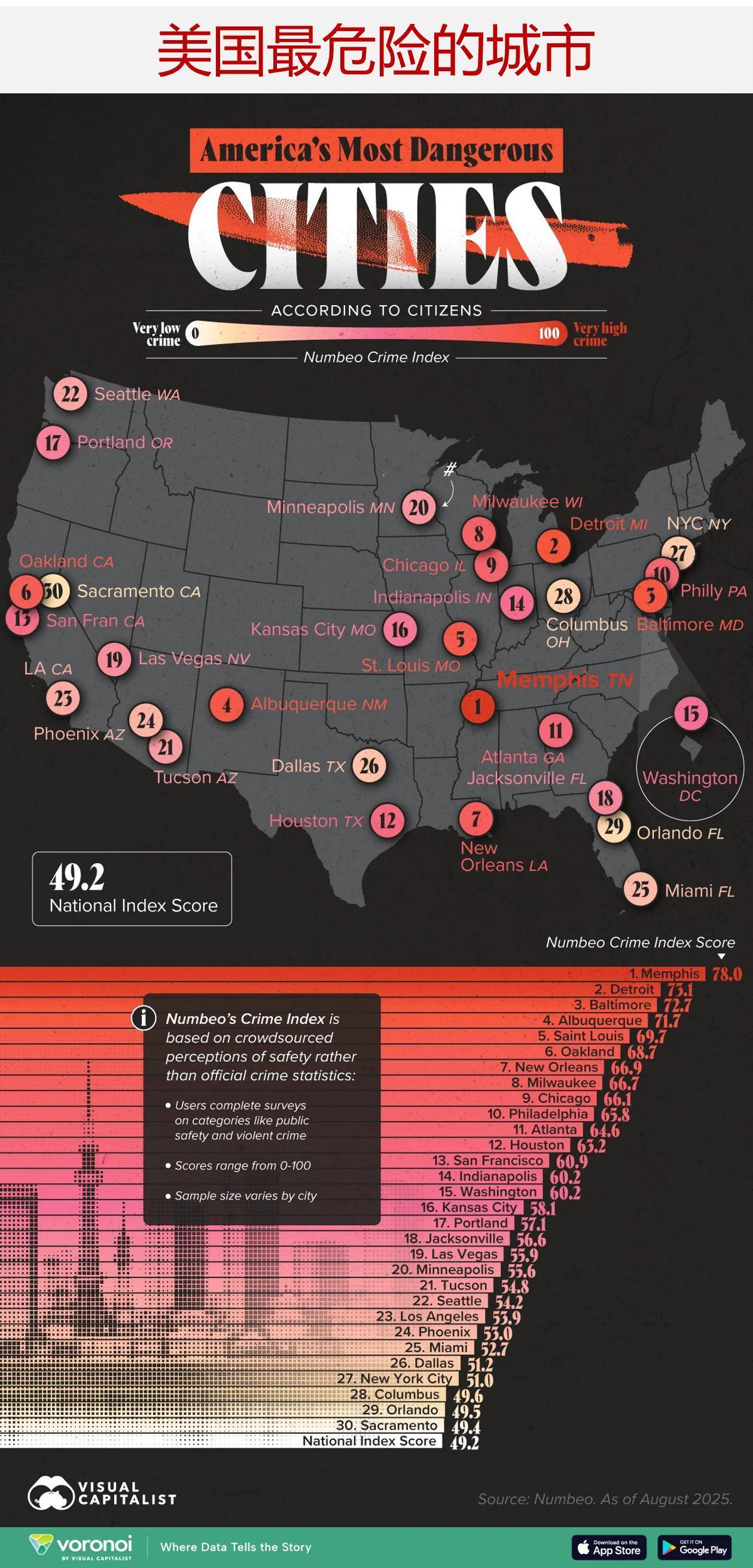 美国人觉得哪里最不安全?来看市民的看法 为回答这个问题,下图根据Numbeo 的犯罪指数结果显示了美国最危险的城市排名。该指数反映了截至 2025 年中期人们对自己所在城市安全状况的看法。与联邦调查局或警方的数据不同,此指数是通过众包调查来反映公众情绪的。 Numbeo 的城市犯罪指数采用 0 到 100 的评分标准,该评分依据的是居民的自我报告经历和看法。该调查涵盖了犯罪的多个方面,包括: 1)对犯罪程度的总体看法 2)白天和夜晚的感知安全性 3)对特定犯罪行为(如抢劫、盗窃、汽车盗窃、身体攻击等)的担忧 4)财产犯罪的严重程度(入室盗窃、盗窃、破坏行为) 5)暴力犯罪的严重程度(包括袭击、谋杀、性犯罪) 如上所述,数值越高则表明居民的不安全感越强。以下是划分这些分数的等级: 1)犯罪率极低:20 例及以下 2)低犯罪率:20.01 - 40 3)中度犯罪:40.01 - 60 4)高犯罪率:60.01 - 80 5)极高犯罪率:超过 80% ——孟菲斯位居排行榜榜首 在榜单前列,田纳西州的孟菲斯市的犯罪指数得分最高,为 78 分,这使其成为美国人眼中 2025 年最不安全的城市。 居民们常常提到暴力犯罪和财产盗窃等问题,这使得该地区的风险感知度普遍较高。 虽然孟菲斯过去一直饱受高犯罪率的困扰,但近期的数据表明其安全状况正在改善。2024 年,孟菲斯的总犯罪率下降了约 13.3%,其中凶杀案下降了约 30%,机动车盗窃案下降了近 39%。 ——铁锈地带和传统的犯罪中心 底特律(73.1 分)和巴尔的摩(72.7 分)仍位列该指数中最具危险性的城市前三名。 自 2008 年以来,这两个城市都面临着关键产业和就业岗位的流失问题,这削弱了它们的经济基础(并减少了税收收入)。这导致贫困率上升,降低了城市的应对能力,并破坏了社区的稳定。