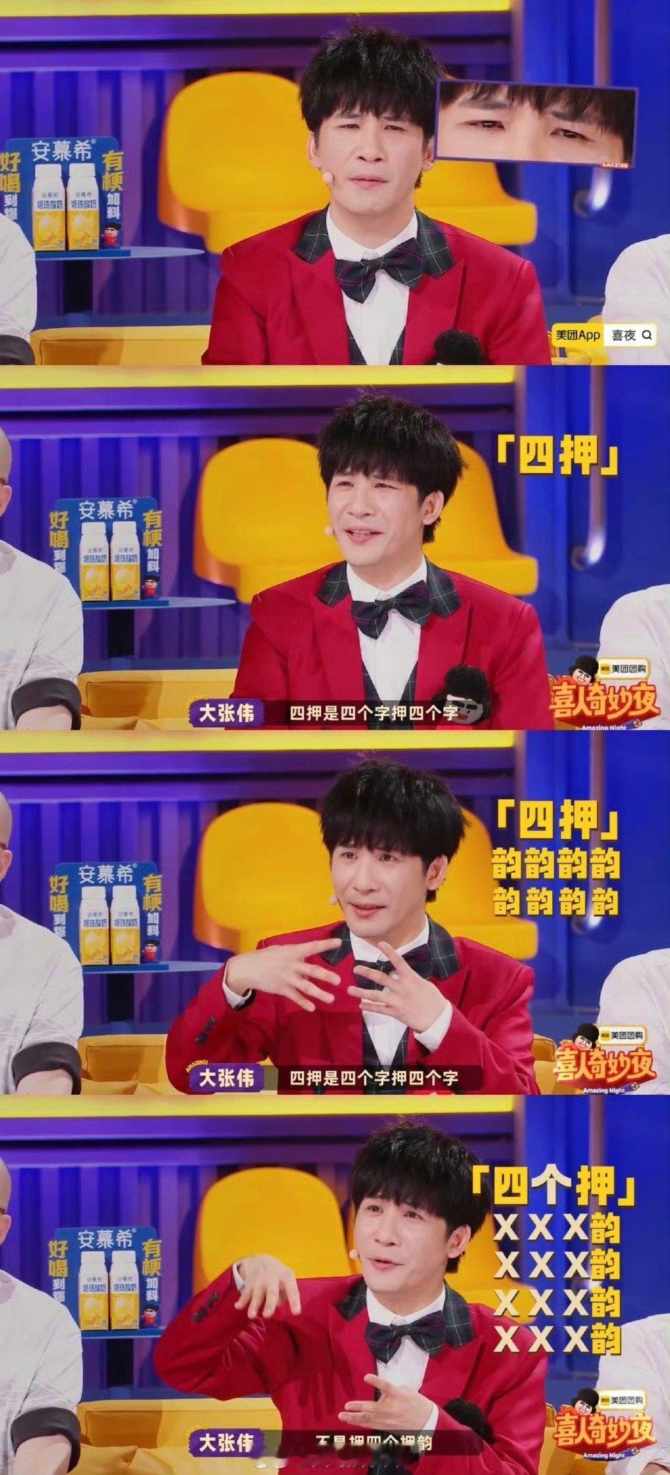 听到这样的四押大张伟陷入沉思喜人奇妙夜 大张伟这波输出绝了!被四押勾出说唱节目回忆,从沉思分析到趣味科普,把音乐人素养和搞笑天赋融合得恰到好处,全程高能。
