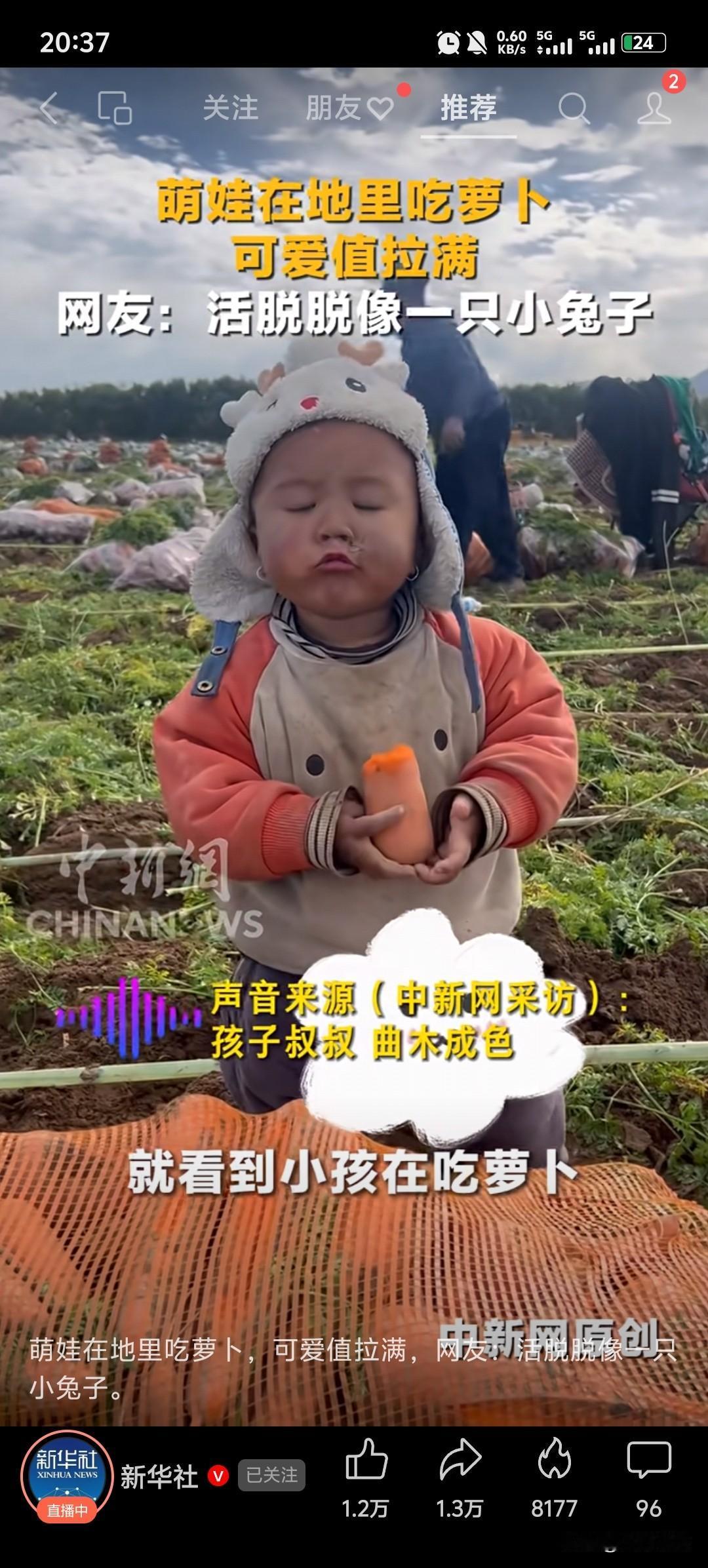 我刚刷到一段短视频,画面里一个孩子在田间地头抱着刚拔出来的大萝卜吃得津津有味,神情专注而满足,仿佛整个世界只剩下手中的萝卜和当下的快乐。 这一幕让我想到,在快节奏、功利化的现代社会,我们往往忽视了生活中最简单的幸福。孩子对新鲜事物的好奇与满足,提醒我们幸福其实很简单——它可能就是一份来自土地的馈赠,一次与自然的亲密接触,或是一种不被外界干扰的专注与喜悦。 这样的画面不仅展现了乡村生活的质朴之美,也让我们反思:在追求物质的同时,不要忘记保留内心那份纯粹。