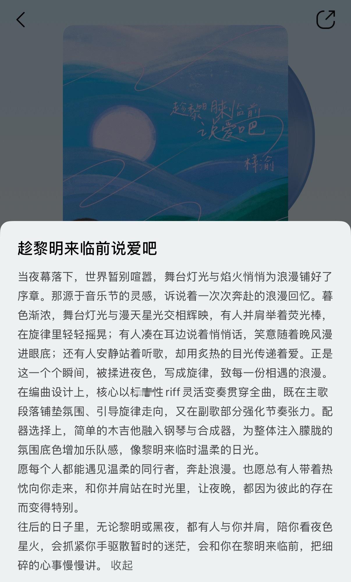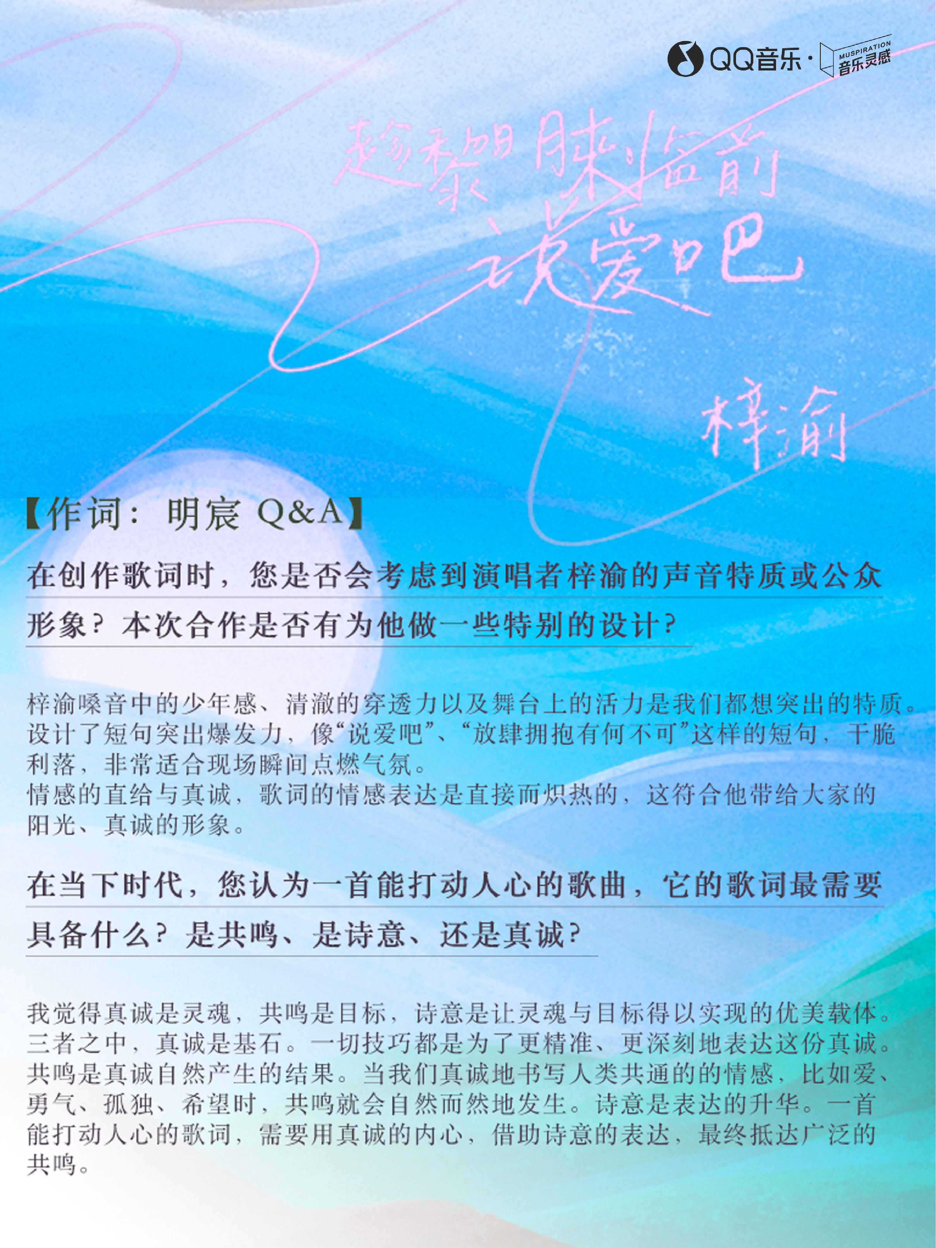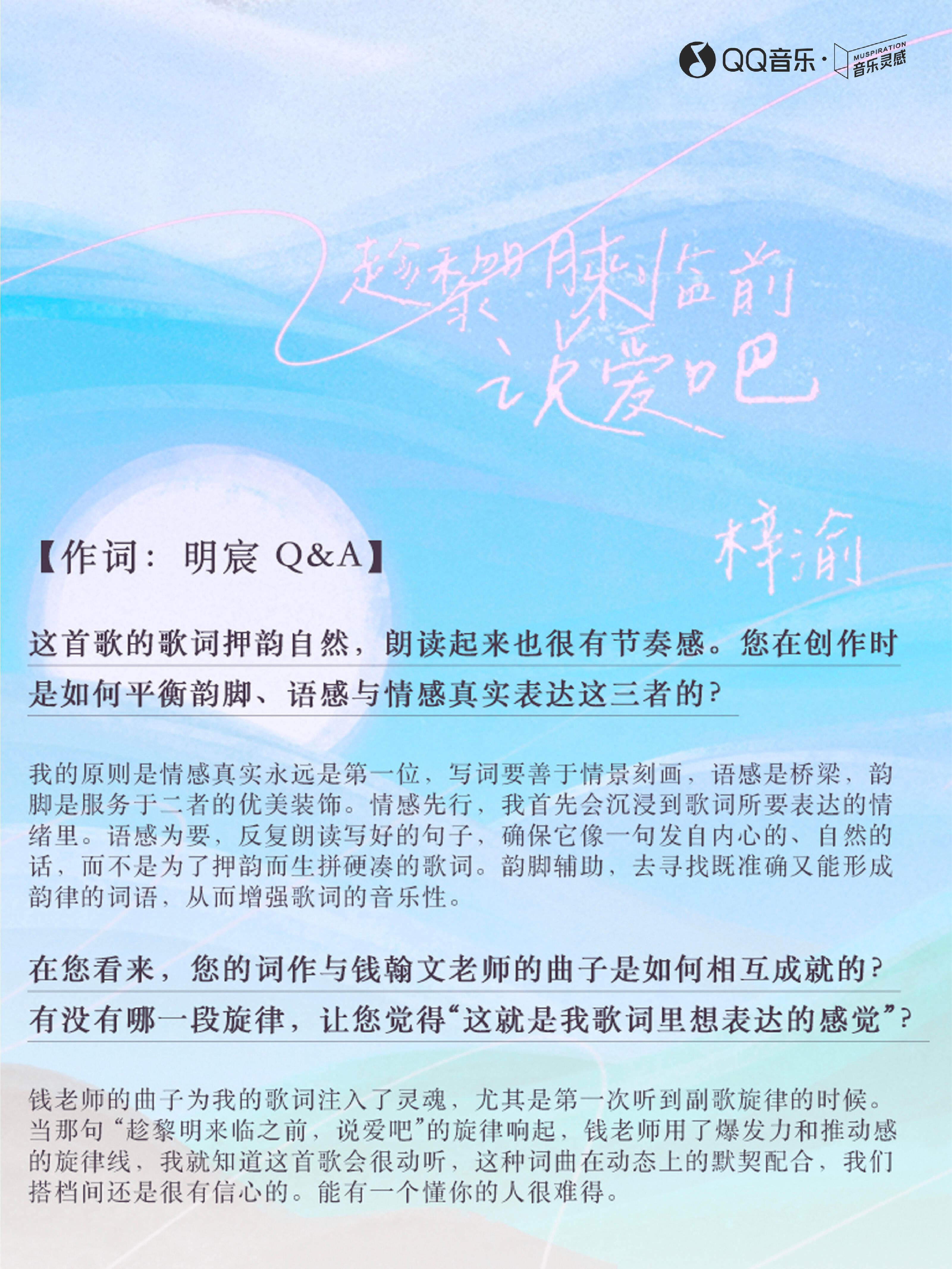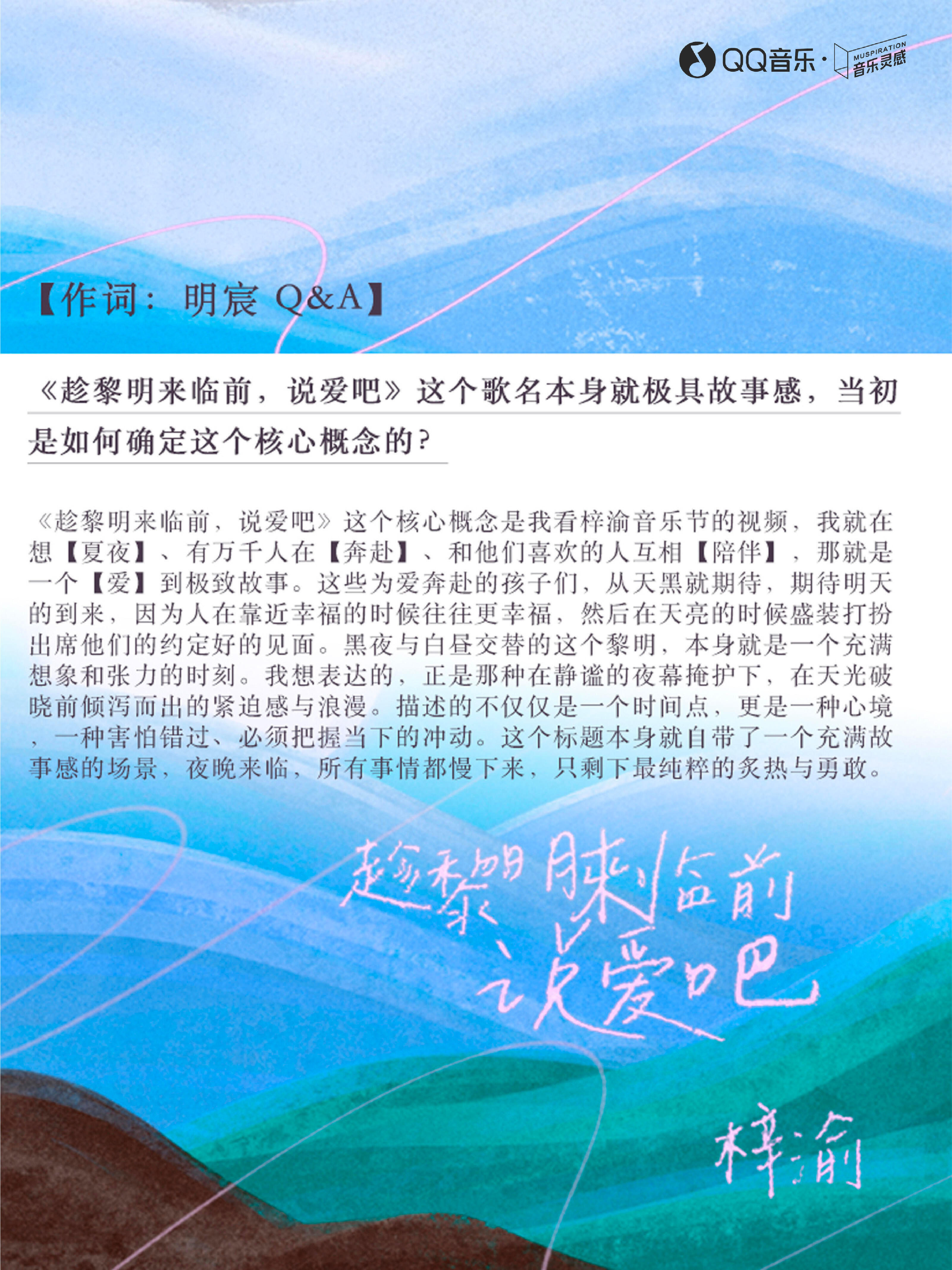 「《趁黎明来临前说爱吧》这个核心概念是看梓渝音乐节的视频,我就在想【夏夜】、有万千人在【奔赴】、和他们喜欢的人互相【陪伴】,那就是一个【爱】到极致故事。这些为爱奔赴的孩子们,从天黑就期待,期待明天的到来,因为人在靠近幸福的时候往往更幸福,然后在天亮的时候盛装打扮出席他们的约定好的见面。黑夜与白昼交替的这个黎明,本身就是一个充满想象和张力的时刻,正是那种在静谧的夜幕掩护下,在天光破晓前倾泻而出的紧迫感与浪漫。」