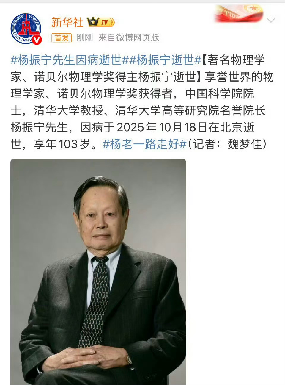 著名物理学家、诺贝尔物理学奖得主杨振宁逝世,享年 103 岁![蠟燭][蠟燭]杨振宁逝世