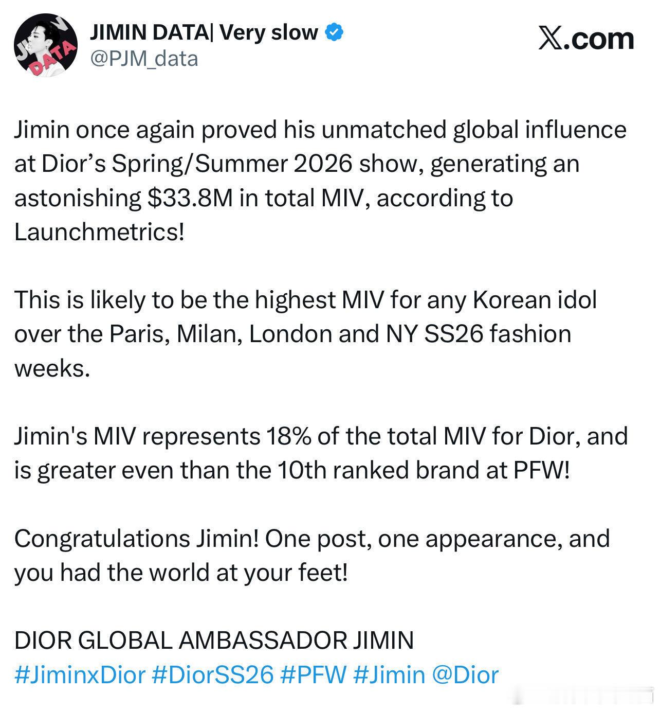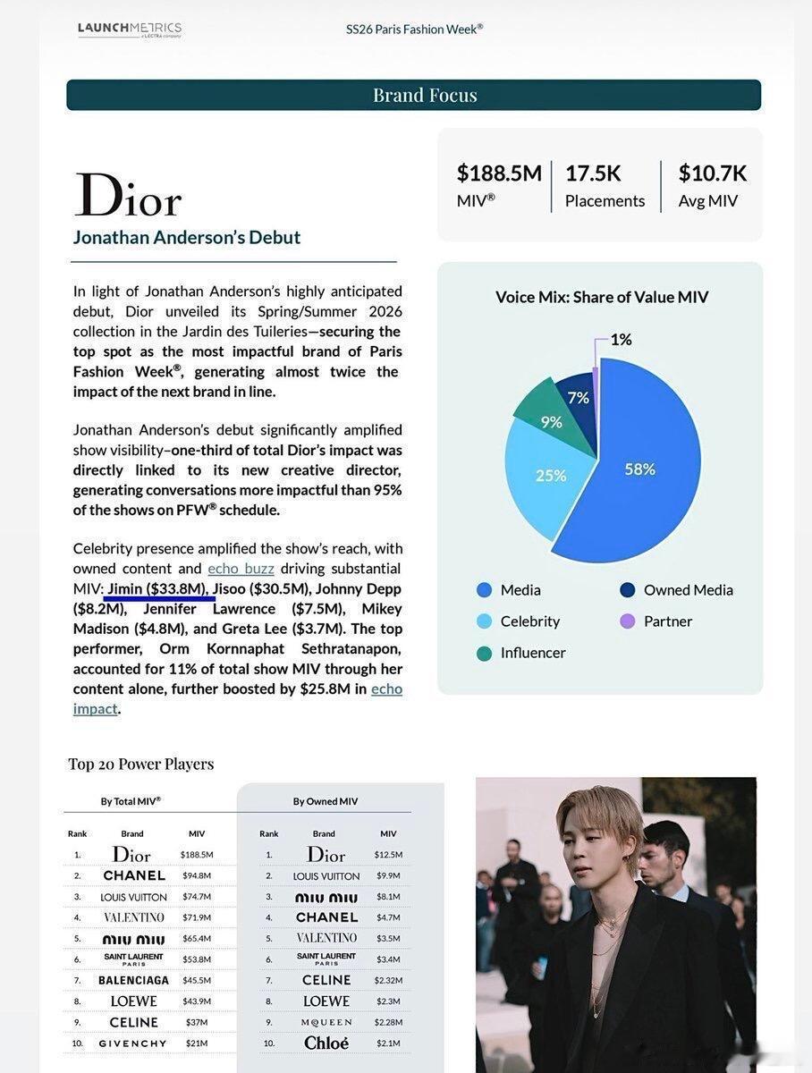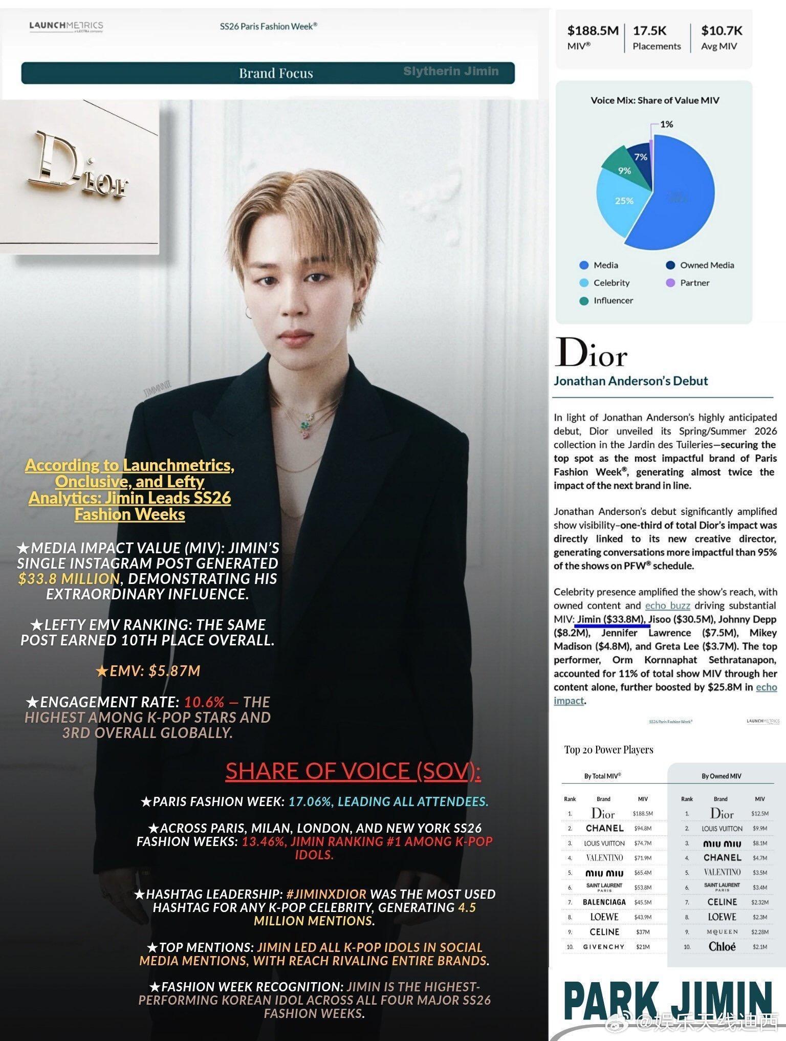 [园丁]创下四大时装周最高MIV的韩国艺人根据领先的时尚分析公司 Launchmetrics 的数据,Jimin 是推动巴黎时装周 SS26 上 Dior 影响力的顶级名人之一,创造了 3380 万美元的 MIV。占 Dior 总媒体价值的18%,甚至超过了巴黎时装周第10名品牌的总媒体价值。🔥