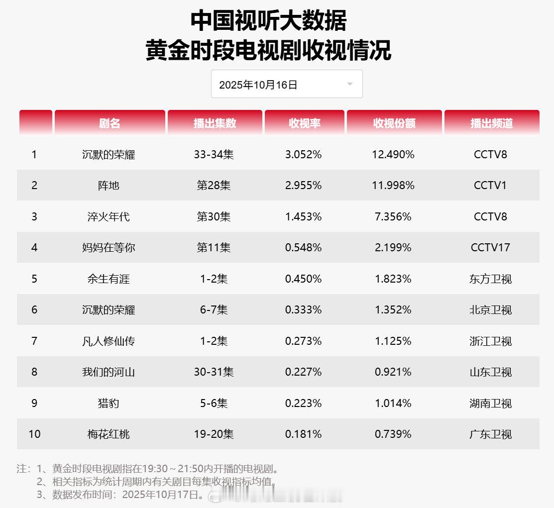 【2025年10月16日中国视听大数据CVB黄金档电视剧收视率日榜TOP10】