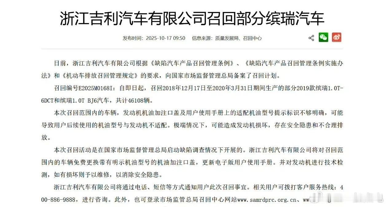 吉利召回是因为加油口和用户手册上的适配机油型号提示不够明确。