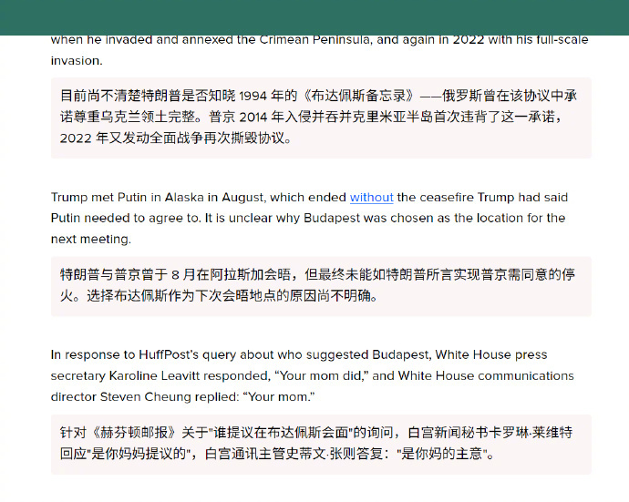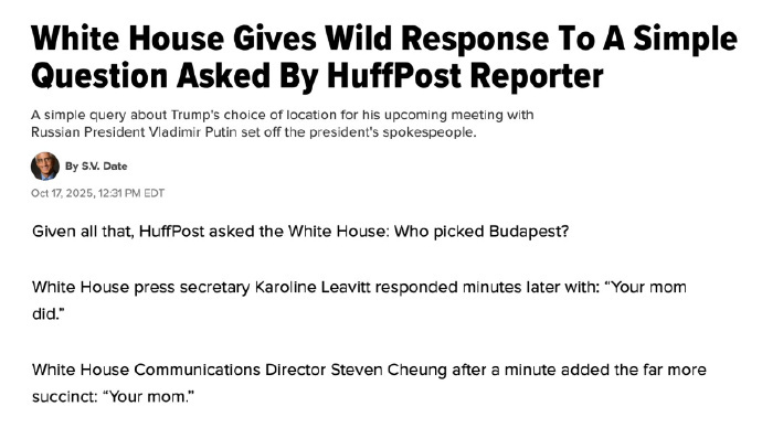 《赫芬顿邮报》记者询问:“谁选择了在布达佩斯举行美俄元首会晤?”白宫新闻秘书莱维特回答道,“是你妈决定的。”