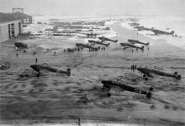 德国空军第76驱逐机联队第2大队的梅塞施密特Bf 110C驱逐机群,摄于1939年冬至1940年春,当时正是驱逐机部队最被看好的一段时间。照片左侧机库入口处可见一架道尼尔Do 17,右侧滑行道外还停放着至少三架容克斯Ju 52运输机。