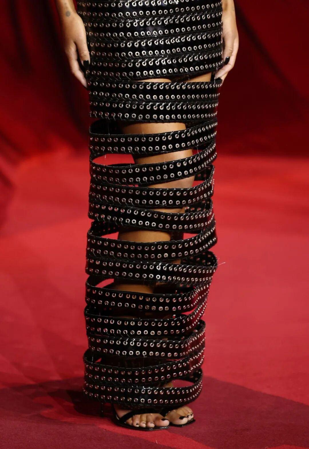 劳拉·哈里尔(Laura Harrier)在学院博物馆盛典(Academy Museum Gala)上所穿的圣罗兰 Saint Laurent 礼服引发关注。 这条礼服是极具设计感的黑色吊带长裙。上身采用紧身胸衣式设计,而裙身与裙体通过一条皮带一体成型,巧妙融入朋克风的酷感元素,视觉冲击力十足。