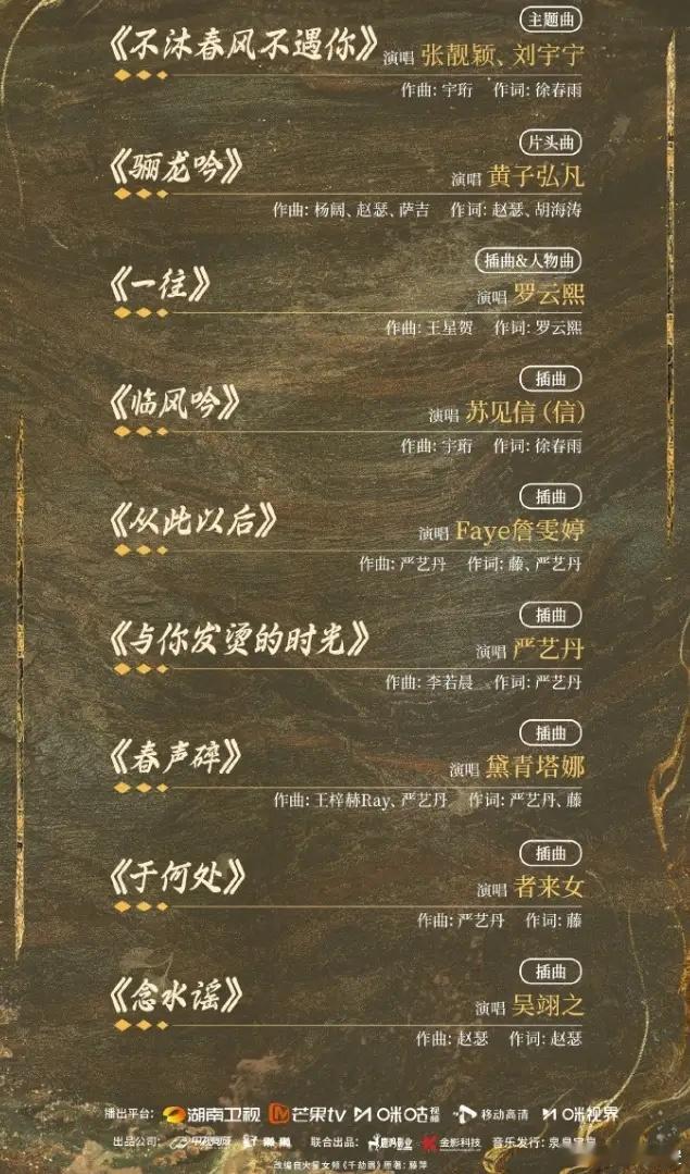 罗云熙《水龙吟》的主题曲请了张靓颖,刘宇宁,黄子弘凡,信,詹雯婷,严艺丹等,基本上都是OST大户,或者影视剧OST有大爆歌曲的歌手来演唱,不过我一直觉得这部剧妆造会拖后腿,男主剧,服道化过于华丽了,现在很多剧男主比女主打扮的还花里胡哨的,但是越经典的长尾口碑剧,服道化往往越素越简单。