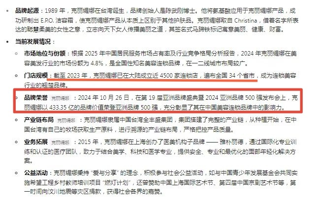 克丽缇娜连续进入亚洲企业500强,全球5000+家门店,年收入几百亿,多次赞助《都挺好》《我的前半生》《流金岁月》等女性电视剧,也是上海电影节的指定合作品牌方,在深入女性事业的同时也在推动乡村基础教育[抱一抱]。