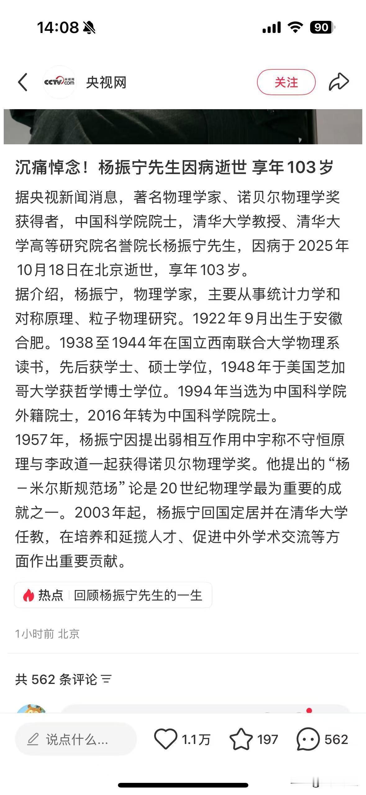 🙏🏻🙏🏻啥也不说了,悼念杨先生,致敬杨先生!太突然了… 前两天还看媒体报道说杨先生精神状态不错,妻子翁女士讲述为什么嫁给杨先生,今天突然说杨先生去世了…一位跨越两个世纪的科学巨人!一路走好!