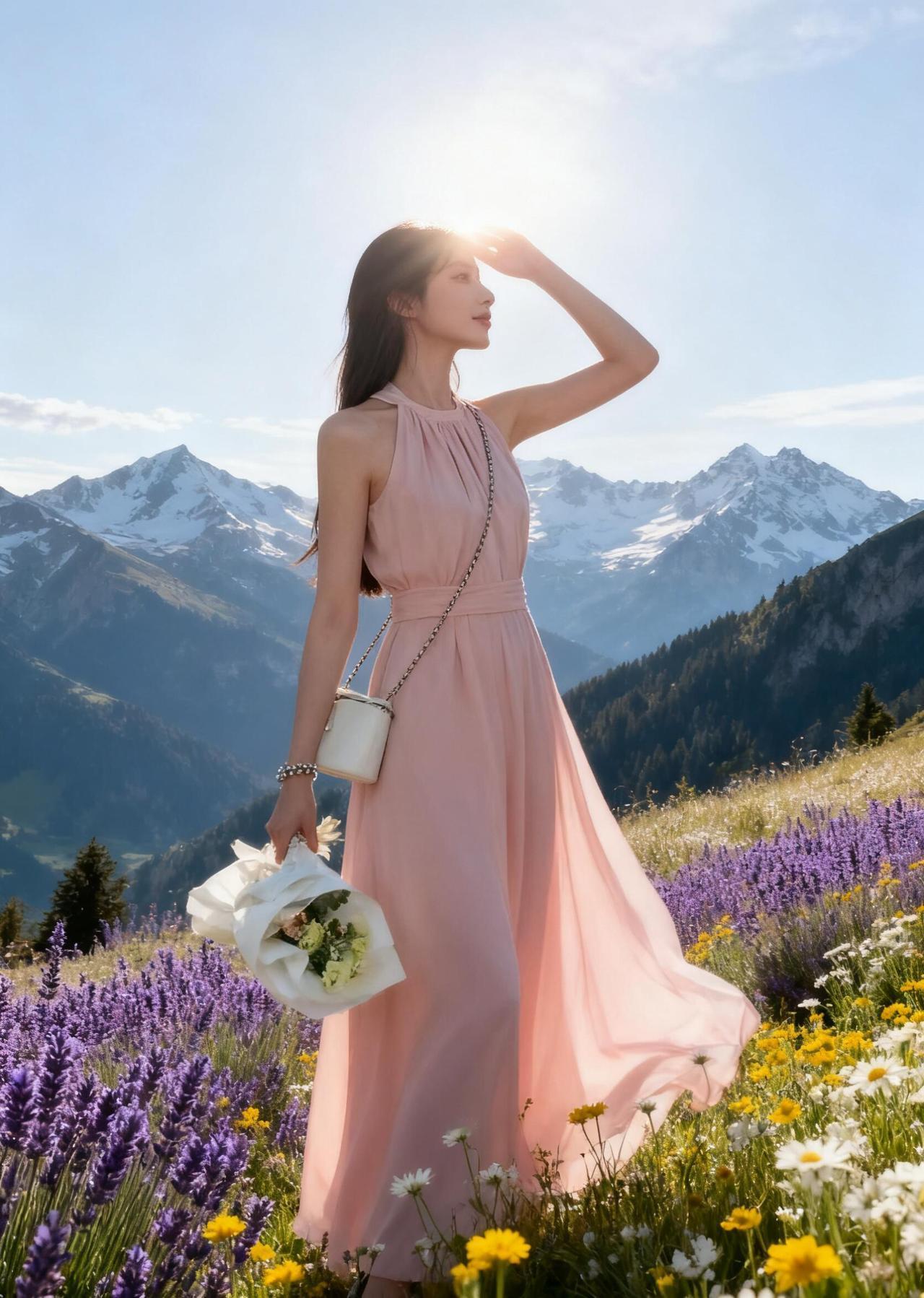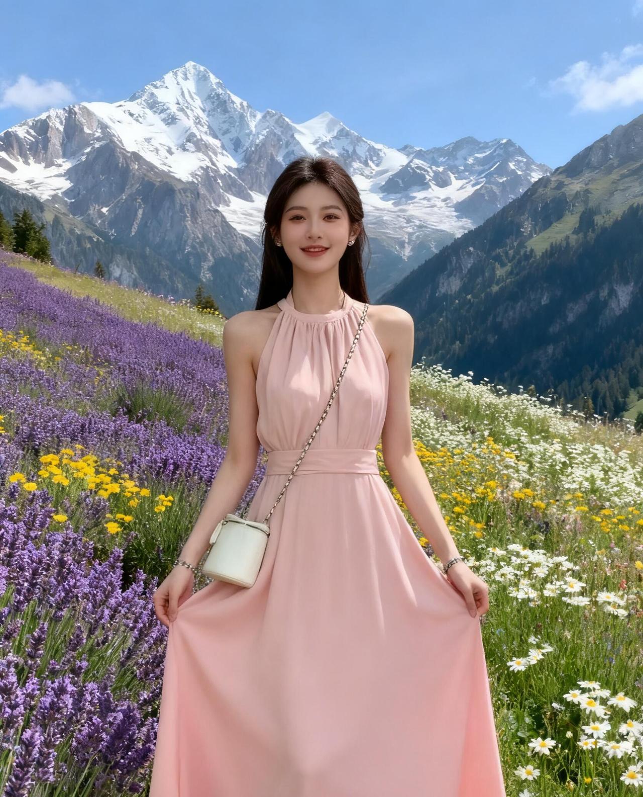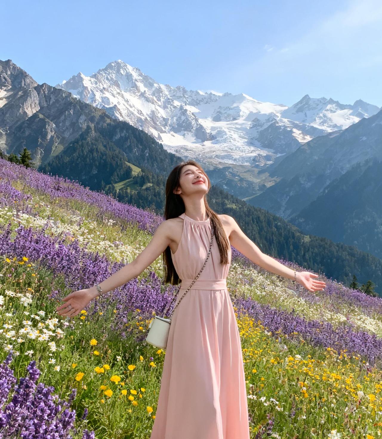 优雅粉裙绿意盎然静享美好时光温柔浪漫粉裙 穿搭