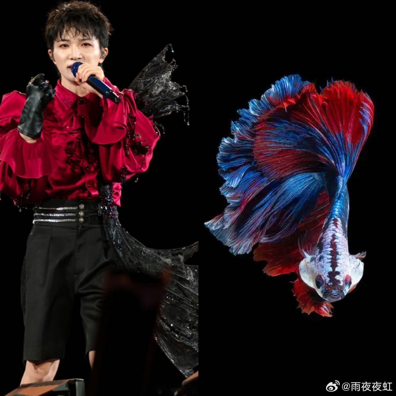 周深凤尾斗鱼造型那黑色小翅膀如同凤尾斗鱼的灵动尾鳍,在舞台光影下闪烁微光,随着他的歌声轻轻颤动,每一个细节都拿捏得ss的。这场视觉与听觉的盛宴,让我彻底沦陷,妥妥成为周深的🐟塑粉!
