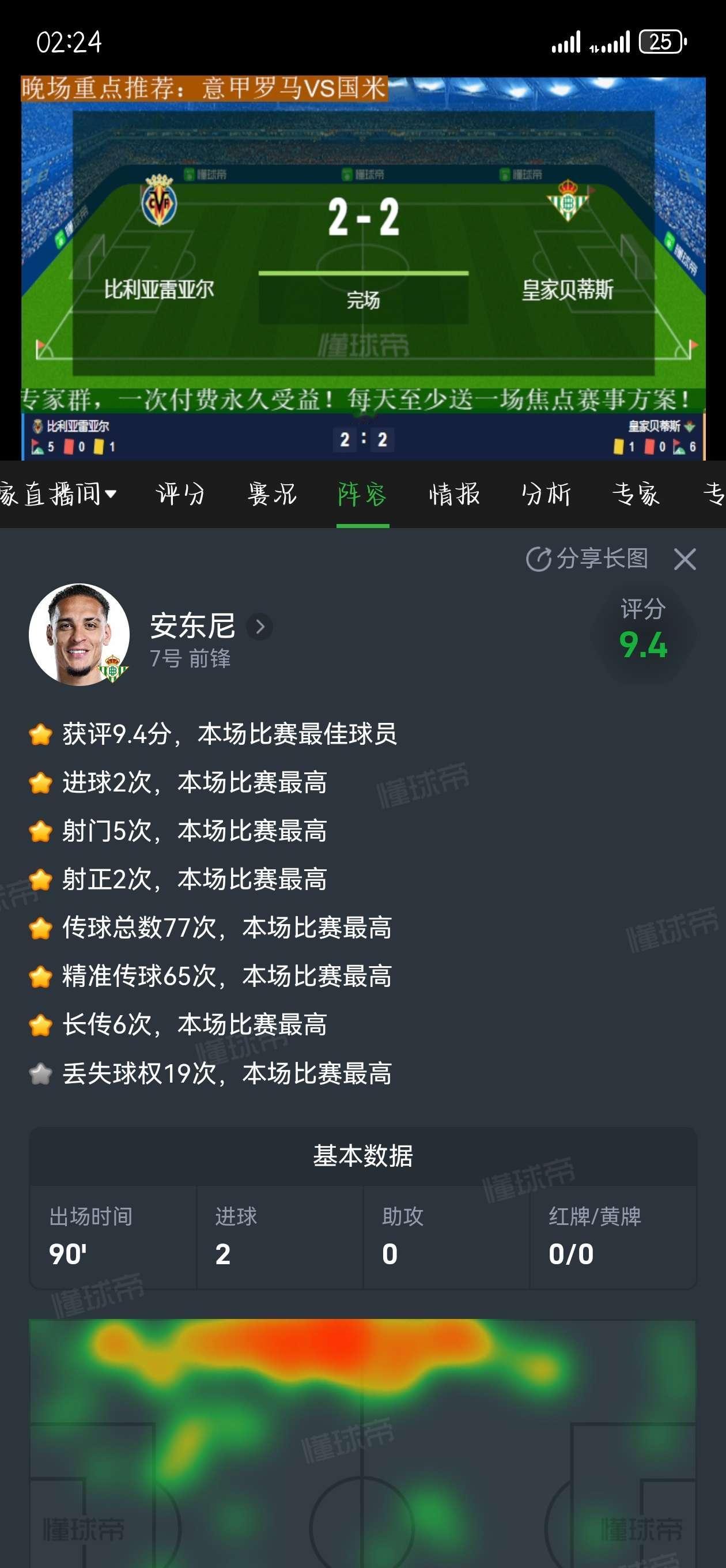 好吓人!安东尼天神下凡真是太牛逼了! 今后球迷们不会再叫安东尼圆神了吧!应该叫球神了吧!再玩梗也没意思了。 今晨西甲这场比赛,皇贝蒂斯对黄潜的比赛太精彩刺激了,当比赛的时间来到80多分钟时,皇贝蒂斯还落后一球,我就在想,安东尼要是能率队绝平对手的话,真是会应验了这句话,有安东尼上场比赛的皇贝蒂斯不会输。 天啊!没想到安东尼天神下凡在最后时刻绝平了对手,真是不开心了。 安东尼打这两粒进球也太漂亮了,一粒进球是第66分钟,安东尼迎球兜射破门,贝蒂斯1-2扳回一球,另一球是在比赛补时最后时刻第93分钟,安东尼右路禁区接直塞球内切到点球点附近低射破门,比利亚雷亚尔2-2贝蒂斯。 皇贝蒂斯客场2-2比利亚雷亚尔,安东尼双响+绝平。西甲 皇贝蒂斯