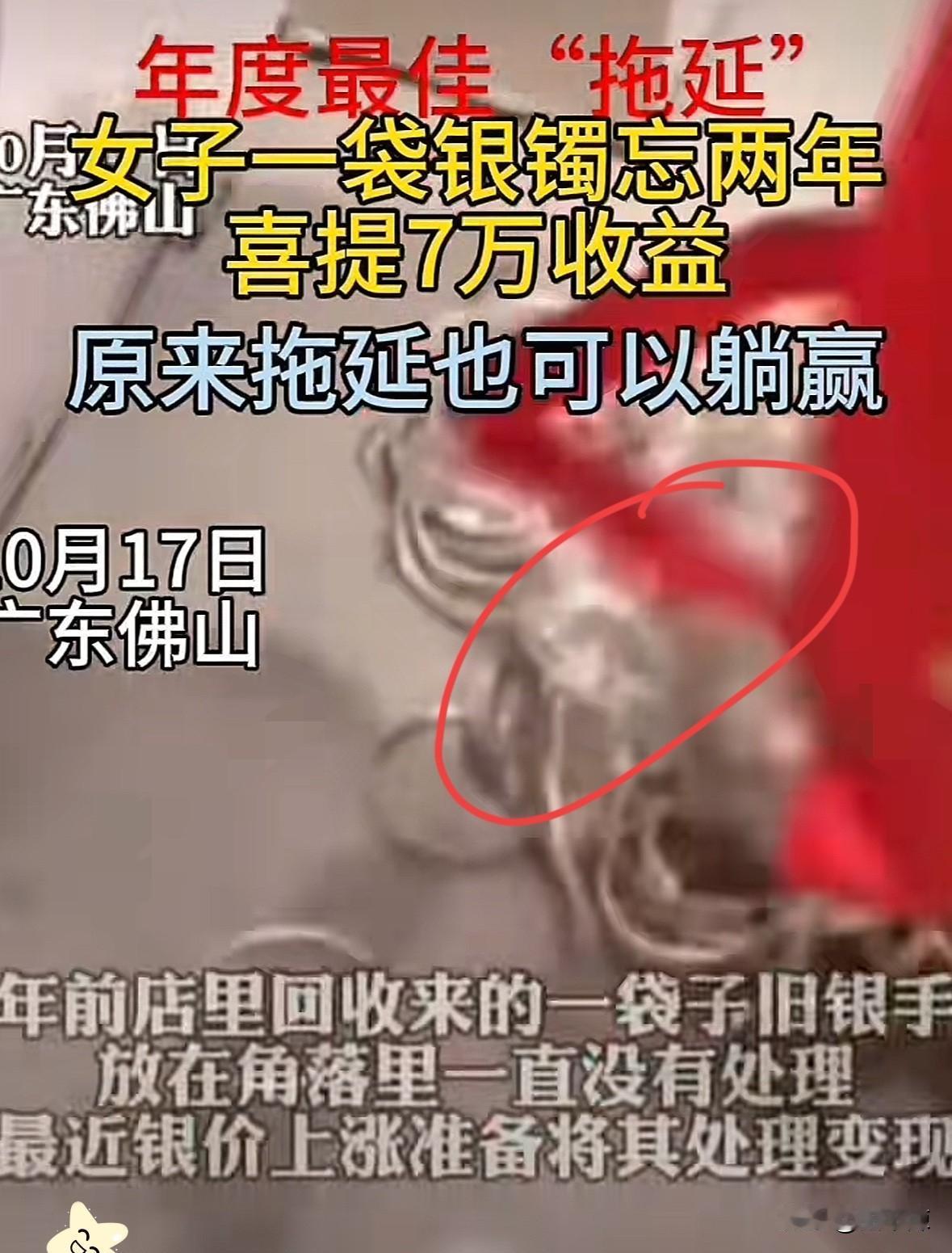 这就是命啊!广东一女子大扫除时,竟然在角落里发现一袋银手镯,原来,2年前他们店搞以旧换新活动,回收了一大袋白银手镯! 三十斤足银氧化发黑却不影响纯度,赶上银价上涨直接净赚76325元,笑称“第一次觉得拖延症是优点”,网友馋哭:“为啥我忘东西不是丢就是坏?” 但别真把运气当本事!这袋银镯能变“提款机”,根本不是拖延症的功劳,首先得有开银饰店、收得起三十斤银镯的实力,其次得刚好撞上银价上涨的时机! 普通人要是跟风囤东西等涨价,大概率要翻车:银价涨跌无常,两年前要是行情下跌,这袋银镯就是妥妥的“赔钱货”! 所谓“无心插柳柳成荫”,前提是你得先种下那棵“柳”。没有实打实的积累,再大的行情红利也跟你没关系! 与其羡慕别人捡了便宜,不如专心把自己的日子过好!