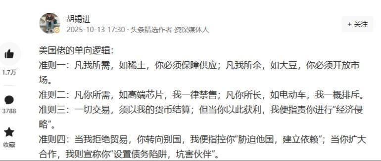 外媒:美国财长呼吁lMF世行严加监管中国经济行为。 近日,据新加坡联合早报报道:“美国财政部长贝森特向国际货币基金组织(lMF)和世界银行发出具体指示,要求这两个国际机构对中国的国家驱动型经济政策采取更强硬立场,重新聚焦其核心使命”。 这又是美国霸权主义,“恶人先告状,反咬一口”霸道作风又一典型事例。看看网上总结美国佬与中国经贸关系中所进行的单向逻辑思维的四点“准则”: 1、凡我所需的如稀土,你必须保障供应,凡我所余如大豆,你必须开放市场。 2、凡你所需,如高端芯片,我一律禁售,凡你所长,如电动汽车,我一概排斥。 3、一切交易,须以我的货币结算,但当你以此获利,我便指责你进行“经济侵略”。 4、当我拒绝贸易,你转向别国,我便指控你“胁迫他国、建立依赖”,当你扩大合作,我则宣称你“设置债务陷阱,坑害伙伴”等。 其实,冷战结束后几十年来,美国习惯了在全球进行霸权主义,搞政治霸权、科技经济霸权等为所欲为。然而,美国财长贝森特反而颠倒黑白要求国际两大组织对中国进行更强硬立场,显然,美国把国际组织当成“自家”打压别国发展、担心威胁到美国霸权地位的“政治工具”,对美国单方面无理对世界各国发起的“关税战”、科技战等遏制打压或胁迫获利行为却只字不提、这难道又是美国可以“例外论”吗? 可见,在世界多数国家都在认可并推行多边主义,在国际贸易中提倡建立在相互尊重、平等相待、互利共赢等基础上时,美国的那套霸权主义、唯利是图、以我为中心的“美国优先”政策已经过时,如果美国不及时反醒并改变其在世界经贸关系中的霸道作风,美国将在世界经济发展中陷入自我孤立地位,将更有害于美国经济发展及美国人民的利益。
