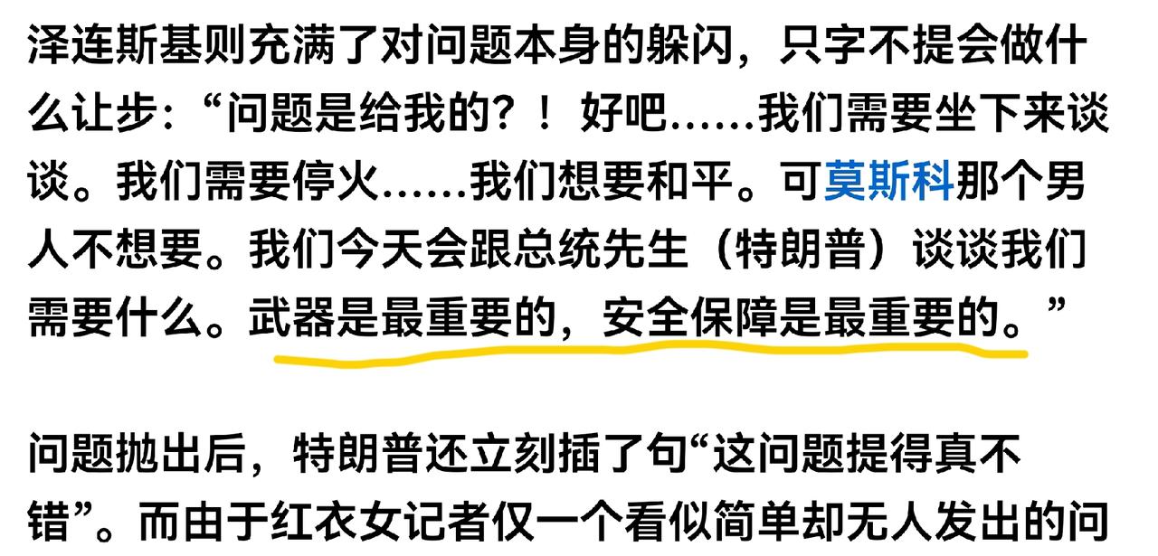 棋子重要,还是对手重要,特朗普给出了答案。泽连斯基在美国回答记者提问时说:“…武器是重要的,安全保障是最重要的”。是的,泽连斯基没有说错,对于乌克兰来说战中外部的支援必不可少,战后外部的安全保障最重要,没有美欧的挑唆和输血乌克兰早已兵败如山倒了。所以为了续命泽连斯基也只能卑微地到处乞讨了,但是,泽连斯基似乎忘了一事,那就是在特朗普眼里,泽连斯基是美俄乌三方中最不重要的那一个。 泽连斯基是西方国家的一枚棋子世人皆知,更是被特朗普玩弄的提线木偶,棋子听话就用,不听使唤定会弃掉。现在特普再次通话,双方一勾兑,泽连斯基听话则吧,不听必被弃。 (图片来自网络)