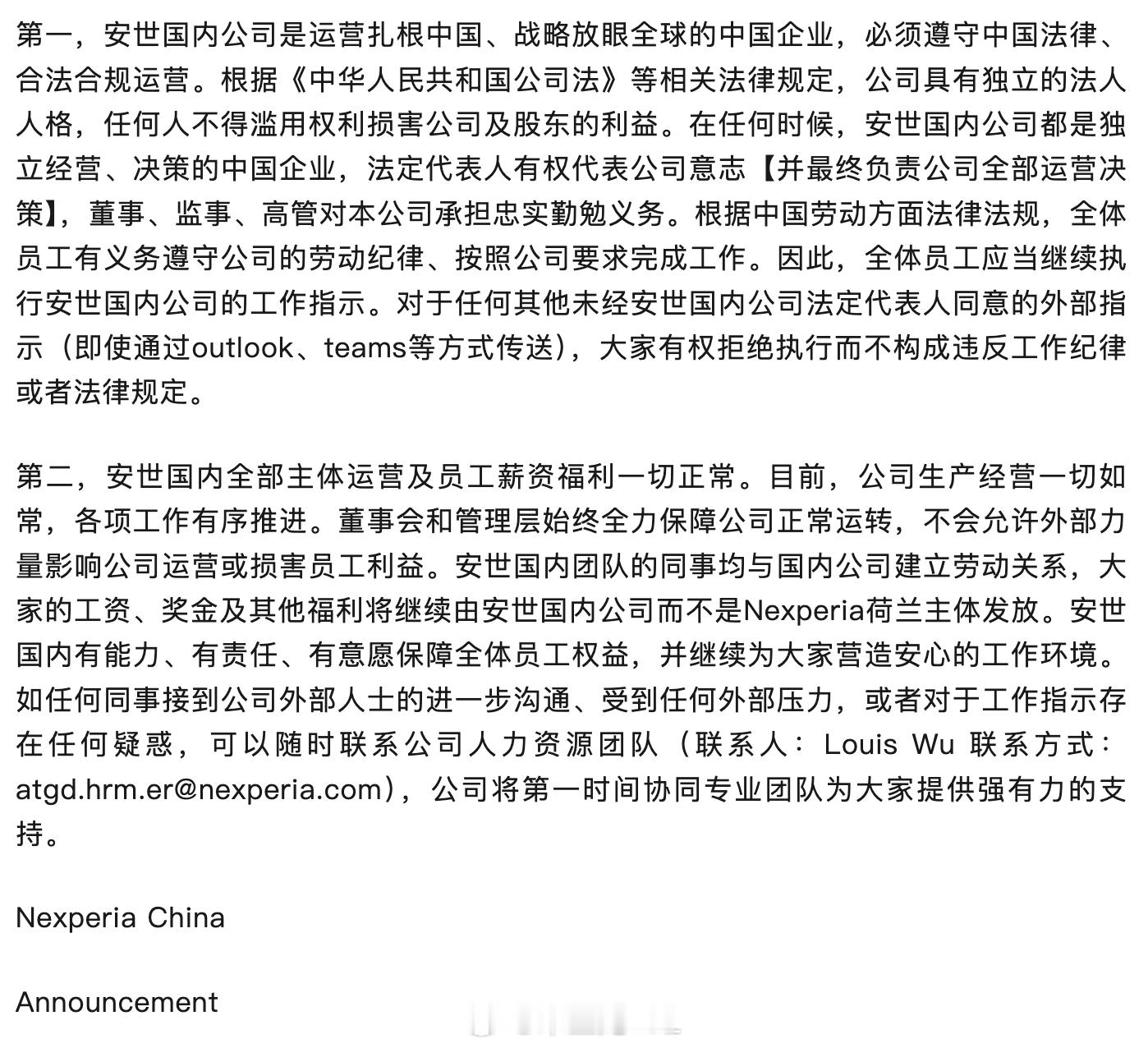 这估计是有力量在帮助安世国内的经营,好消息是安世国内全部主体运营及员工薪资福利一切正常,安定人心才能往前走。这个消息发出来对于维护安世国内的客户非常重要,否则哪怕从荷兰佬这里拿回来,公司也散了。