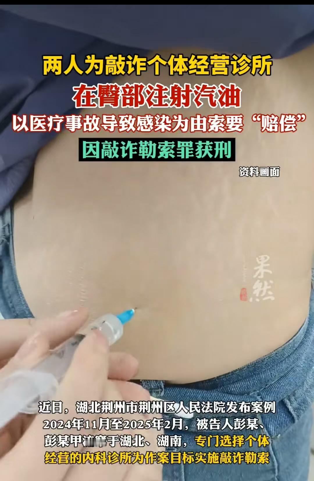 湖北,一名男子到诊所打了消炎针后,另一名男子迅速凑上前,在他刚扎过针的臀部又打了一针汽油。透明的液体渗入皮肤,很快就红肿起来,伴随着灼热的痛感,局部皮肤也开始发炎。随后,两人脸上带着掩饰不住的得意,并肩来找医生索赔,本以为能轻松骗到钱,没想到事情最终败露,两人不仅都被判了刑,还缴纳了高额罚金。 彭某甲和彭某是同乡,都没有正式工作,平日里游手好闲,总幻想着天上掉馅饼的好事。 可日子一天天过去,馅饼没等到,生活却愈发拮据,口袋里的钱越来越少,连基本开销都快撑不住。 两人蹲在出租屋里合计,琢磨着找个轻松又快速的挣钱方式。在网上翻了大半天,看了不少门路,要么觉得成本太高投不起,要么觉得危险系数大不敢碰,挑来挑去都不满意。 最后,他们在一堆歪门邪道里,找到了一条自认为最高效便捷的路子:牺牲一个人的健康,去敲诈街头的小诊所。 彭某甲体格壮实,身体底子好,两人一拍即合,就由他来充当受害者,承受那针汽油带来的痛苦。 办法定下来后,两人立刻分工合作。彭某先拿着手机在周边转悠,挨家查看大大小小的诊所,专挑那些规模小、老板看着老实、容易拿捏的目标,很快就锁定了第一家下手的诊所。 确定目标的当天下午,彭某甲就捂着肚子走进诊所,假装自己尿路有感染,疼得厉害,催促医生赶紧给打消炎针。 医生没多想,按流程配药、注射,针头刚拔出来,躲在诊所门口角落的彭某就快步上前,拿出早已准备好的针管,对着彭某甲的针眼处,飞快地打了一针汽油。 皮肤瞬间红肿起泡,炎症反应来得又快又明显。 紧接着,彭某陪着龇牙咧嘴的彭某甲回到诊所,一进门就拍着桌子,大声向医生讨要说法,张嘴就索要上万元的高额赔偿,声称是医生打针失误导致感染加重。 诊所老板围着彭某甲的臀部看了半天,也没找出问题出在哪,又怕事情闹大,被街坊邻居看到影响生意,只能咬着牙,不情愿地掏出钱了事。 第一笔敲诈顺利得手,两人拿着骗来的钱去吃了顿大餐,兴奋得睡不着觉,觉得这招太好用,决定举一反三多次作案,靠这个捞取更高额的收益。 就这样,他们揣着针管和汽油,流窜于湖北、湖南的多个乡镇,先后挑了3家小诊所下手,一共敲诈了3万余元。 起初那几家诊所的老板,都抱着大事化小、小事化了的心态,不想惹麻烦,宁愿赔点钱把人打发走。 可轮到第四家诊所时,老板性格格外强硬,看着彭某甲臀部上的红肿,笃定自己的医术没问题,不可能打出这样的后果,当场就和两人争辩起来,语气强硬地要求他们拿出证据。 这两人本就做贼心虚,遇到之前那些怕事的诊所,还能装装样子施压,可面对态度强硬、不肯退让的老板,顿时慌了神,说话都开始颠三倒四,眼神也不敢直视对方。 最后,这家诊所老板觉得事有蹊跷,悄悄调出了诊所的监控视频,把两人一前一后打针、索赔的画面发布到了当地的商户群里。 此前受害的几家诊所老板看到视频,才恍然大悟,原来不是自己医术不行,而是这两人早就设下了圈套,专门来骗钱的。 几家诊所赶紧联合起来报警,把两人每次敲诈的时间、金额、言行举止都详细告诉了民警。 民警根据线索,很快就锁定了两人的行踪,迅速将彭某甲和彭某抓捕归案。 两人被抓后,没抵抗多久就对所做之事供认不讳,面对民警的讯问,还一脸委屈地辩称,知道错了,只是实在没找到挣钱的好办法,才走了这条路。 可不好挣钱从来不是违法的理由,市面上有那么多正经工作可选,哪怕是去工地搬砖、去餐馆端盘子,都能靠力气挣干净的钱,他们却偏要走歪路,想着不劳而获,终究要为自己的贪心和侥幸付出代价。 最终,法院审理后,判处彭某有期徒刑一年,并处罚金1万元;判处彭某甲有期徒刑十一个月,并处罚金8000元。 《刑法》第二百七十四条规定,敲诈勒索公私财物,数额较大或者多次敲诈勒索的,处三年以下有期徒刑、拘役或者管制,并处或者单处罚金。 彭某和彭某甲以非法占有为目的,通过精心设计的苦肉计,多次以医疗事故导致感染为由,对诊所医生进行威胁、要挟,索要高额赔偿,作案三起共计勒索财物3万余元,属于数额较大,其行为已构成敲诈勒索罪。 《民法典》第一千一百七十九条规定,侵害他人造成人身损害的,应当赔偿医疗费、护理费、营养费、住院伙食补助费等为治疗和康复支出的合理费用,以及因误工减少的收入。 彭某向彭某甲的臀部注射汽油,人为造成其臀部严重红肿、发炎,侵害了彭某甲的身体健康,给彭某甲造成了身体上的伤害和经济上的损失,彭某甲因此产生的医疗费、护理费等合理费用,彭某应当予以赔偿。 对于此事,大家如何看? 素材:齐鲁晚报2025-10-19