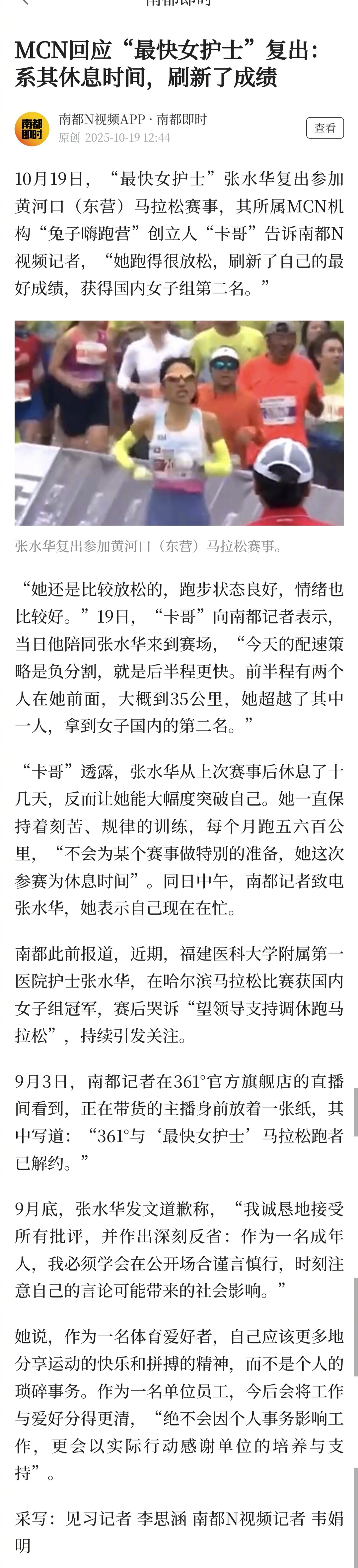 #最快女护士复出后刷新成绩#【MCN回应“最快女护士”复出:系其休息时间,刷新了成绩】#MCN回应最快女护士复出#10月19日,“最快女护士”张水华复出参加黄河口(东营)马拉松赛事,其所属MCN机构“兔子嗨跑营”创立人“卡哥”告诉南都N视频记者,“她跑得很放松,刷新了自己的最好成绩,获得国内女子组第二名。”