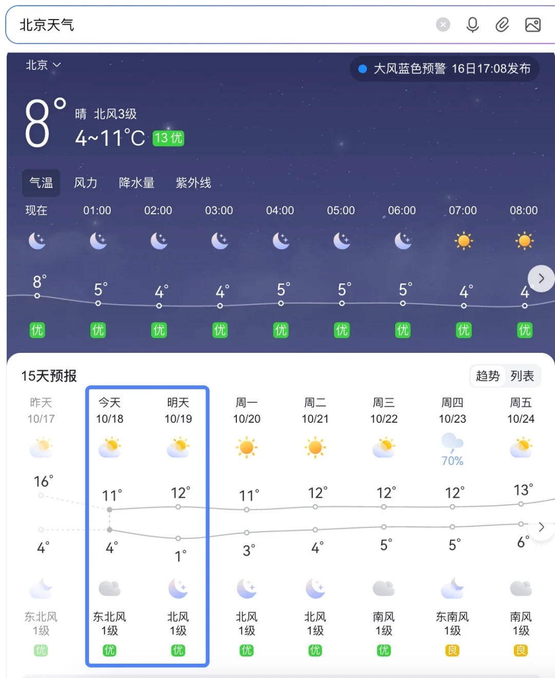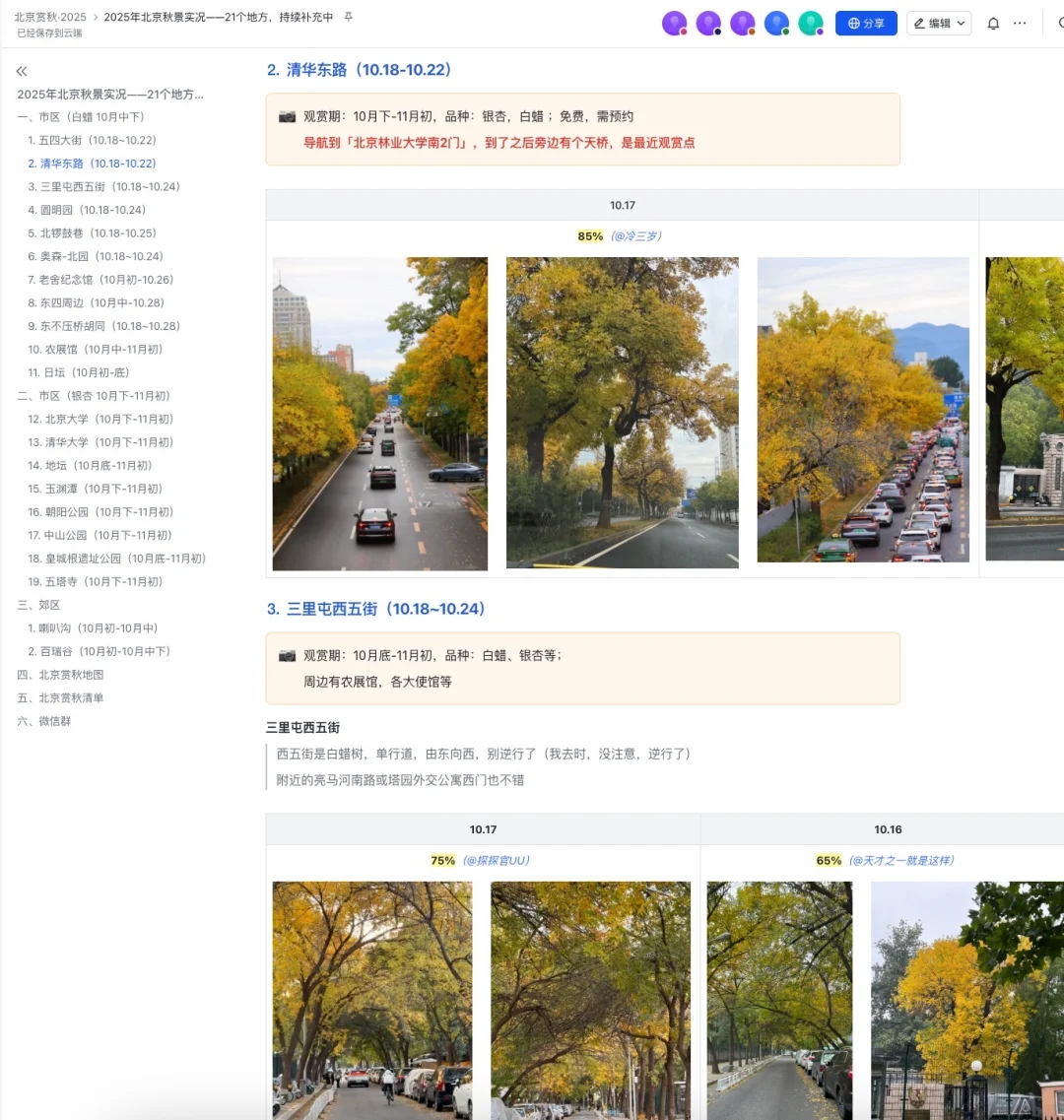 图1~2是囊括了北京20+个赏秋的地方 是和网友一起整理的,公开分享的文档 每天会更新实况照片,真实,无滤镜 [向右R]根据这一周的观察,选出11个作为第一批赏秋地方 主要就是看白蜡,最近4天是最佳观赏期 最晚的估计可能持续到下周末 这只是北京赏秋先锋队 [向右R]银杏预计要到下下周末才开始黄,目前还绿着 11月第一周是最佳观赏期 这是北京赏秋主力军 [向右R]而北京的红叶,主要是黄栌,要到11月中了 香山,坡峰岭就是 [打卡R]回归正题,本周末(10.18~19)可以逛哪些地方呢? 选出来如下,及预测观赏时间 照片均为这两天拍的,真实无滤镜 1.五四大街:图3~4 最火,人最多,适合拍氛围,进度80% 最佳观赏期:10.18~22 2.清华东路:图5~6 小众,人少,适合拍大街,进度85% 最佳观赏期:10.18~22 这个我非常推荐 导航到「北京林业大学南2门」 到了之后旁边有个天桥,是最佳观赏点 3.三里屯西五街:图7 小众,适合拍小道,进度75% 最佳观赏期:10.18~10.24 典型叶子没黄就开始掉了 4.圆明园:图8 人多,特点是旁边有水池,好看,进度75% 最佳观赏期:10.18~10.24 叶子也开始掉了,秃了 5. 北锣鼓巷:图9 人适中,周末可能多了 胡同口财神庙这颗黄透了,往里走还没太黄,进度50% 最佳观赏期:10.18-10.25 有可能下周末还能看 6. 奥森-北园:图10 看白蜡,还有粉黛乱子草,向日葵 本地人多些 10.18~10.24 7.老舍纪念馆:图11 看柿子,离五四大街很近,需要预约 10.26之后就没了 8.东四周边:图12-13 有很多胡同,其中十三条和辛寺胡同最好看 还有很多还没黄,估计下周末也可看 9.东不压桥胡同:图14 在南锣鼓巷旁边,人也不多 两棵树,一颗白蜡,一颗银杏 白蜡还不太黄,是北京这批垫底的 大概率下周末才黄透,进度45% 最佳观赏期:10.18~10.28 10.农展馆:图15-16 白蜡在停车场两侧,不多 不用特意来 银杏还绿着,但图16我太喜欢了 11.日坛,看菊花展,很美,免费 [打卡R]天气和穿衣 如图17,周日最冷1° 今日颐和园(比市区冷2°左右)路人穿衣(图18) 供参考 我穿了卫衣+冲锋衣,没穿秋裤毛衣 到了晚上8点,在路上走着,冻手,腿也很凉