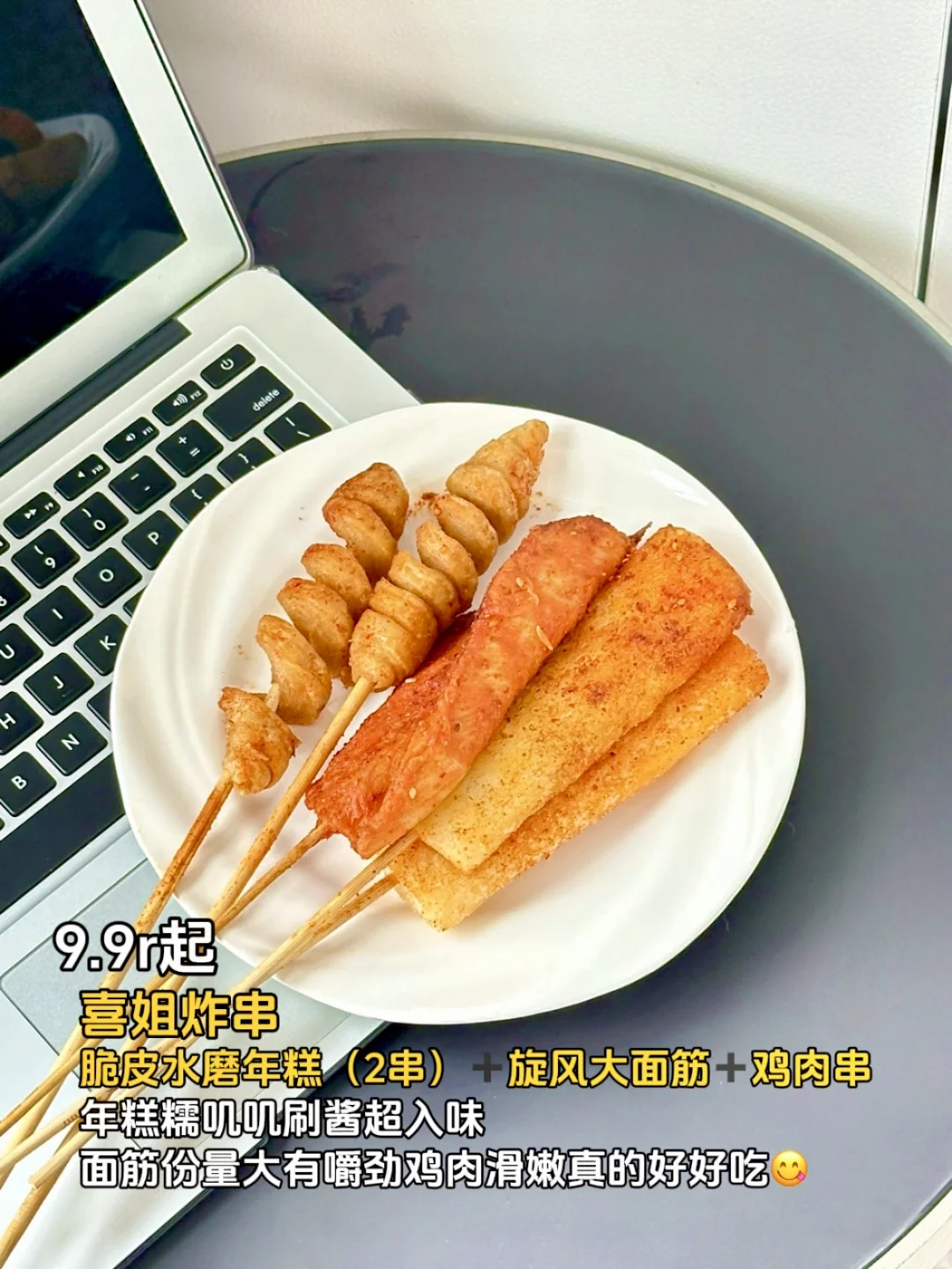 ✅9.9元起喜姐炸串的脆皮水磨年糕(2串)➕旋风大面筋➕鸡肉串,年糕糯叽叽刷酱超入味,面筋份量大有嚼劲,鸡肉滑嫩真的好好吃😋