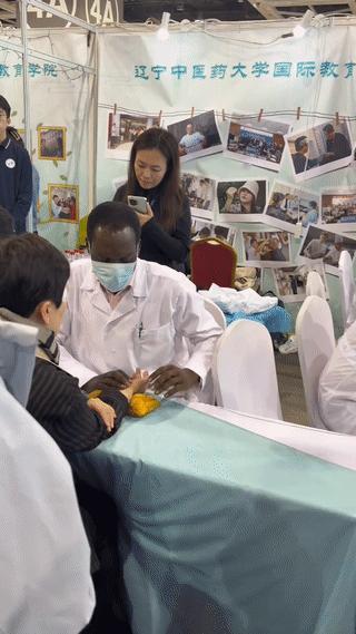 一位学习中医的非洲黑人留学生正在活动现场为一位大妈把脉看病。 黑哥详细的询问了大妈的病情,问她身体有什么不舒服? 看起来非常的认真负责。黑中医