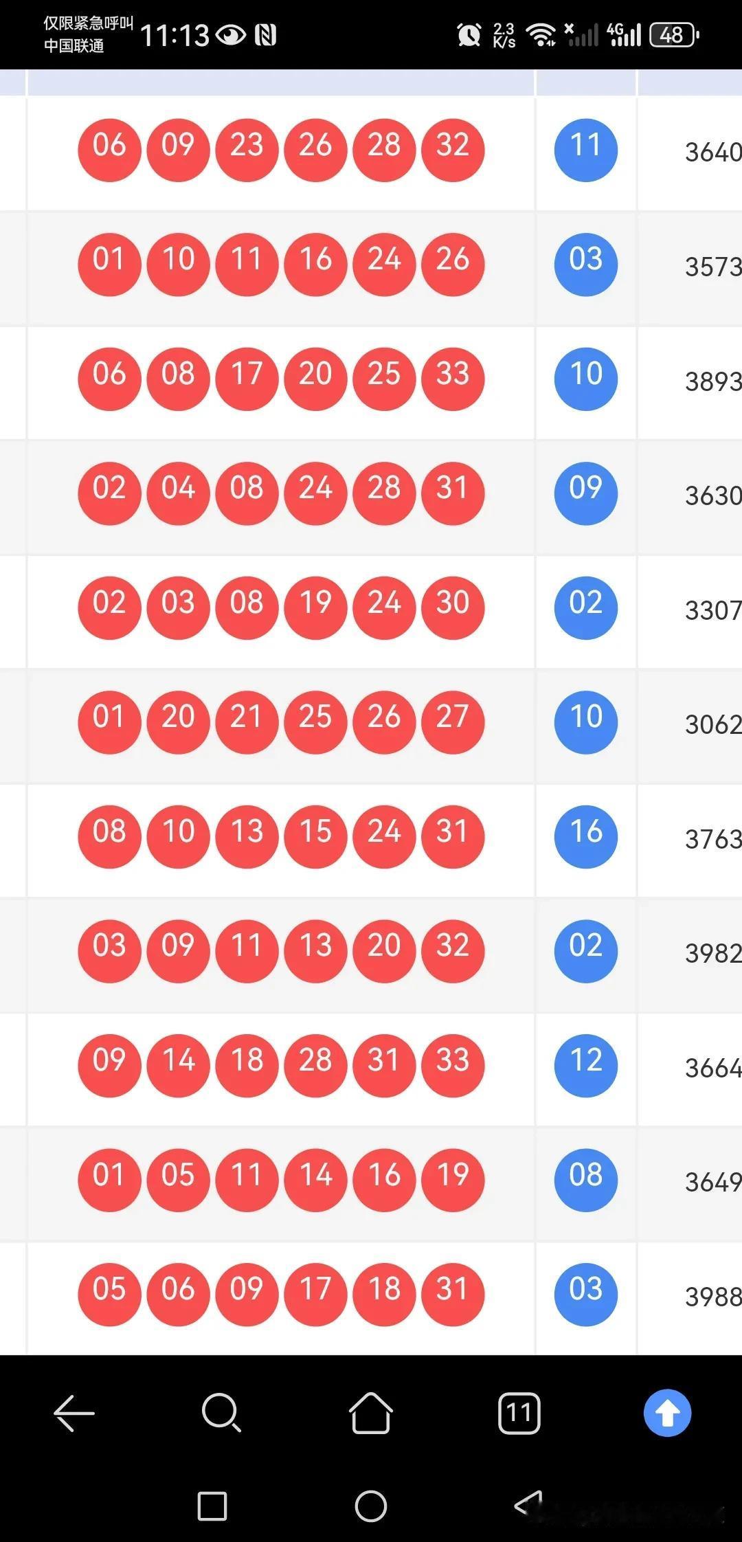 今天没有推荐参考号,给大家看看湖北大佬丹丹推荐的号码,大家猜猜能中几个号码,个人预测,红球不会超过3个,蓝球为0。 (个人观点,仅供参考)