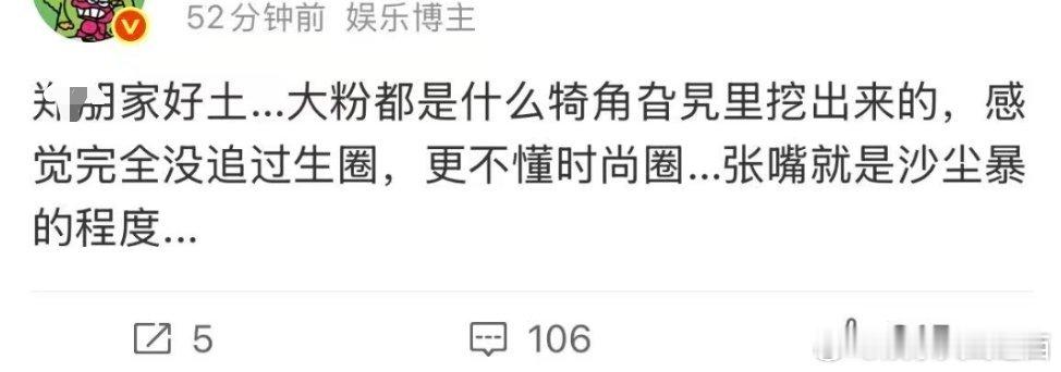 田雷家好土...大粉都是什么犄角旮旯里挖出来的,感觉完全没追过生圈,更不懂时尚圈...张嘴就是沙尘暴的程度...