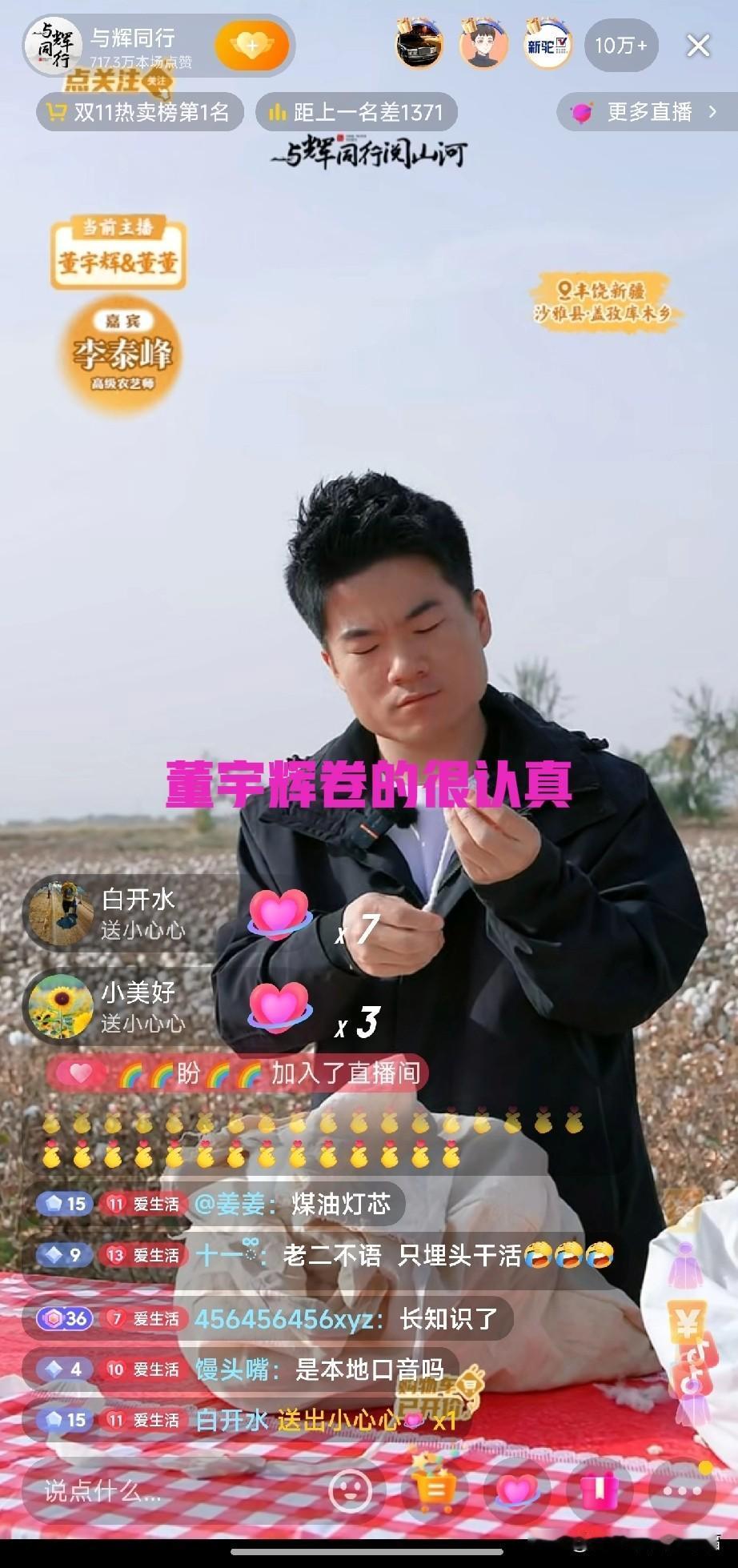 与辉同行外场,就是行走的教科书,透过镜头传递了很多的知识,让屏幕前的粉丝知道了很多新鲜的事情。 今天是新疆棉,新疆棉产业是新疆的一大经济支柱。在这一大片咧嘴笑着的白花花的棉花地旁,李老师给我们讲解了棉花的历史,原来小时候的煤油灯芯,就是用这棉花拧成绳做的。董董和董宇辉听的非常认真,他们手也没闲着也跟着老师做了起来,一团小小的棉花,只要把它拧成一条绳,就能做成蜡烛芯,给黑暗送去一份光亮。 与辉同行用实际行动展现了我们的祖国地大物博。