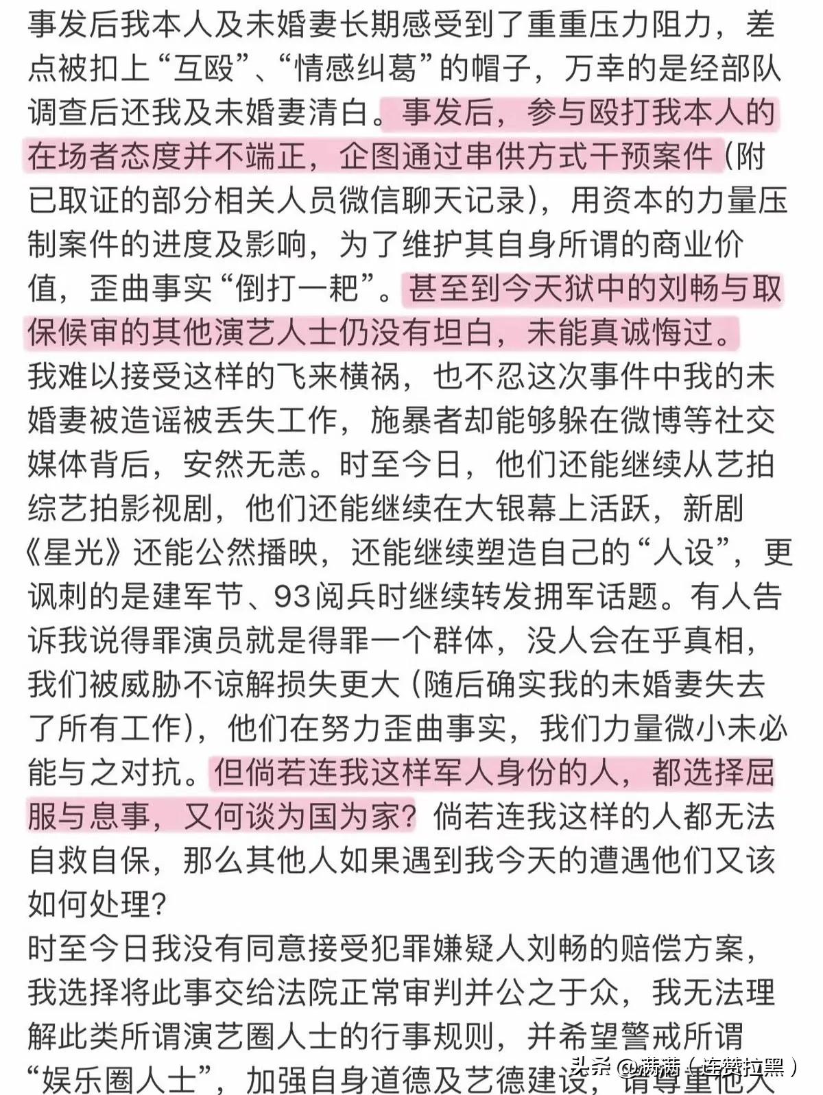 刘奕畅吴崇轩动手打军人,这事儿一出,基本可以宣告俩人彻底凉透了。 聚会完跟现役军人起冲突,居然直接动手把人打伤,这哪是冲动,分明是没把规矩和底线放在眼里。军人报警,警方带走调查,听说艺人那边还想串供压事,最后还是部队出面才没让歪风得逞。证据摆在那儿,刘奕畅被刑拘进了看守所,新剧还在播着呢,人先翻了车。品牌连夜撤资,节目急着剪镜头,粉丝还想洗白,结果被全网群嘲,这场景,真是一点不冤。 吴崇轩也跑不掉,配合调查的消息一出来,口碑一夜之间就塌了。说白了,不管你是明星还是普通人,对着保家卫国的军人动手,就是在挑战所有人的底线。军人的尊严,从来不是谁能随便践踏的,那是用汗水和牺牲换来的,容不得半分亵渎。 总有人觉得明星头上有光环,出点事能花钱摆平,能靠粉丝吆喝洗白。可这次不一样,法律面前哪有什么特殊待遇?动手的那一刻,就该想到后果——前途砸了,名声臭了,再后悔也没用。粉丝与其忙着洗地,不如劝自家偶像好好认错,这才是唯一的正道。 说真的,艺人拼到最后,拼的不光是演技和流量,更是做人的本分。连最基本的尊重和敬畏都没有,摔跟头是迟早的事。这俩人算是给所有公众人物提了个醒:别拿自己当特殊人物,守不住底线,再高的人气也救不了你。 各位读者你们怎么看?欢迎在评论区讨论。