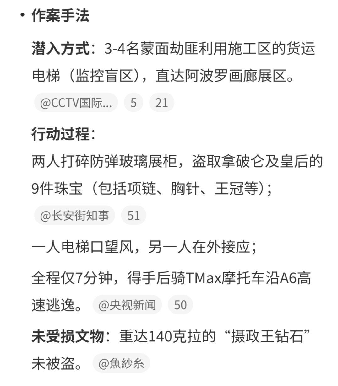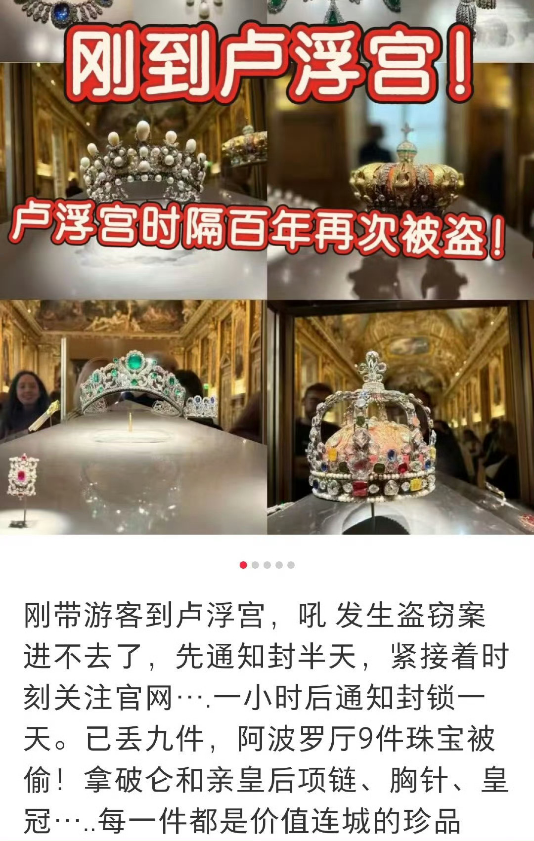 卢浮宫多件藏品被盗也就是说世界四大博物馆之首、万宝之宫的卢浮宫。在7分钟的时间内被几个匪徒盗走了多件、总价值超5000万欧元的藏品,然后安全离开了!惊天魔盗团电影都不敢这么拍吧,关键是用的还不是什么高科技手段,这安保漏洞也太大了!卢浮宫被盗过程仅7分钟