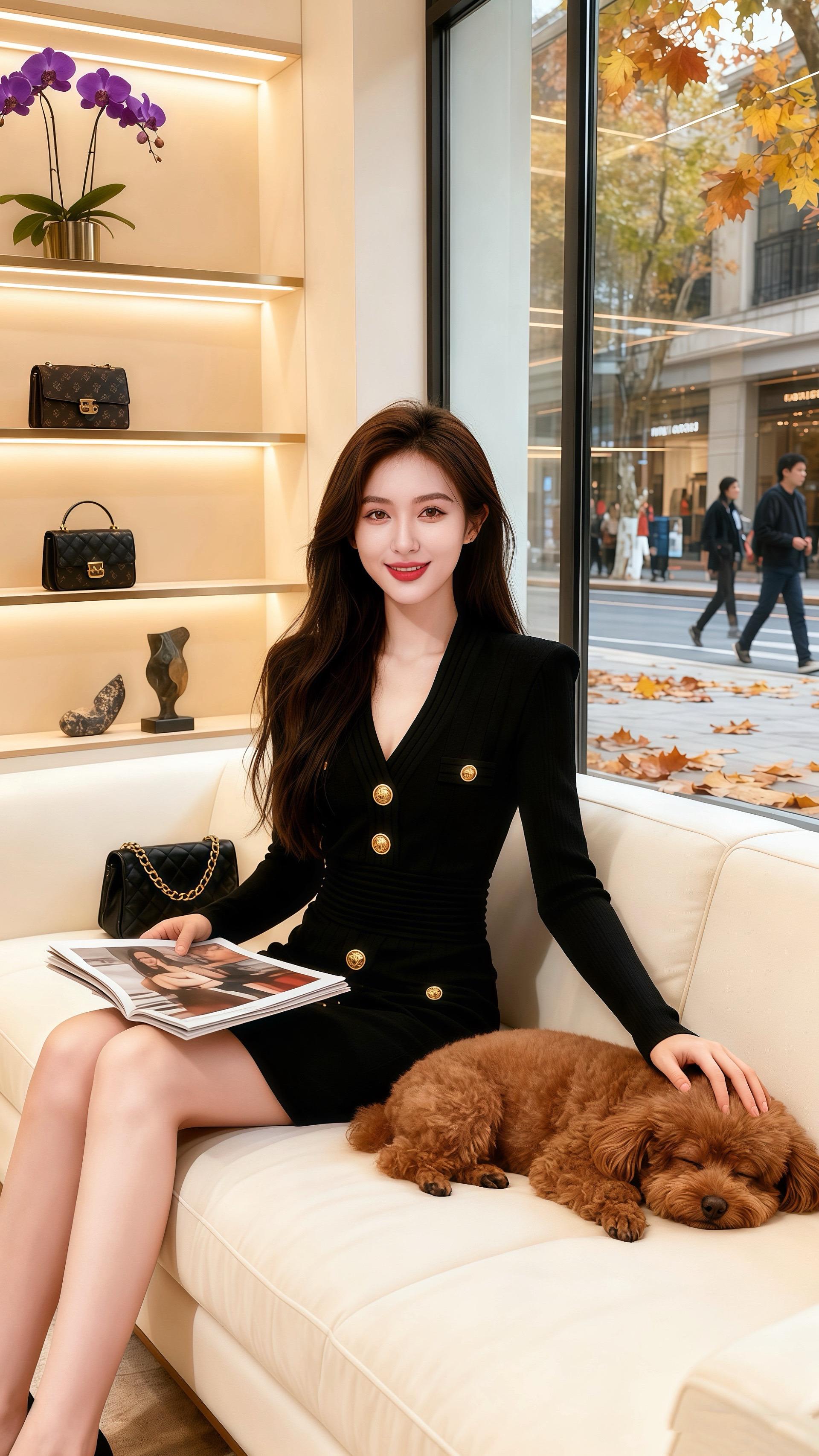 秋日的午后,阳光透过女装店的大玻璃窗,在地板上洒下斑驳的光影。许妍抱着泰迪犬“可可”,站在落地镜前,身上那件黑色金扣连衣裙,将她的身姿衬得格外优雅。