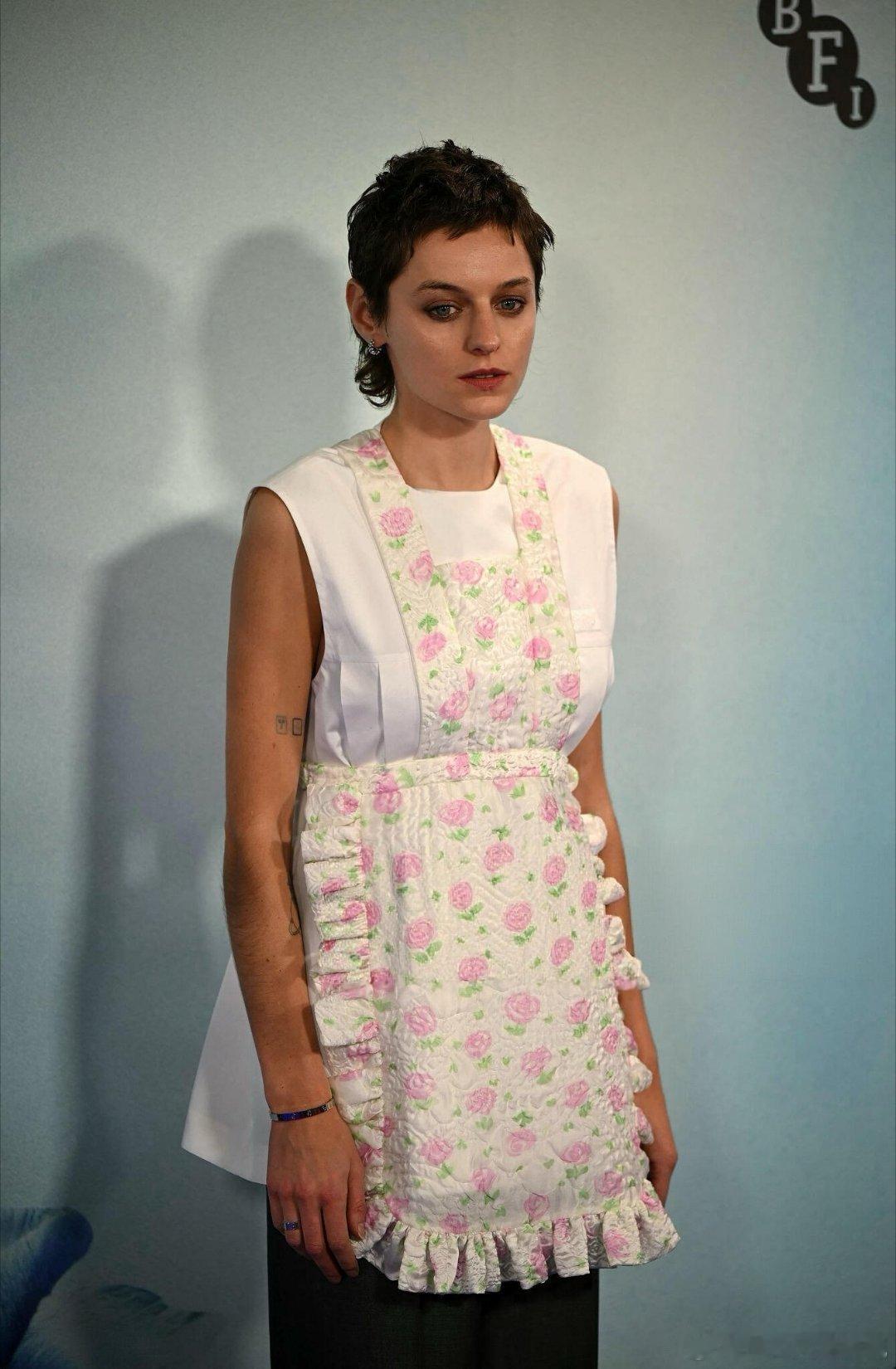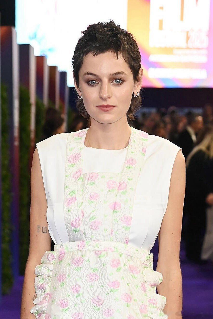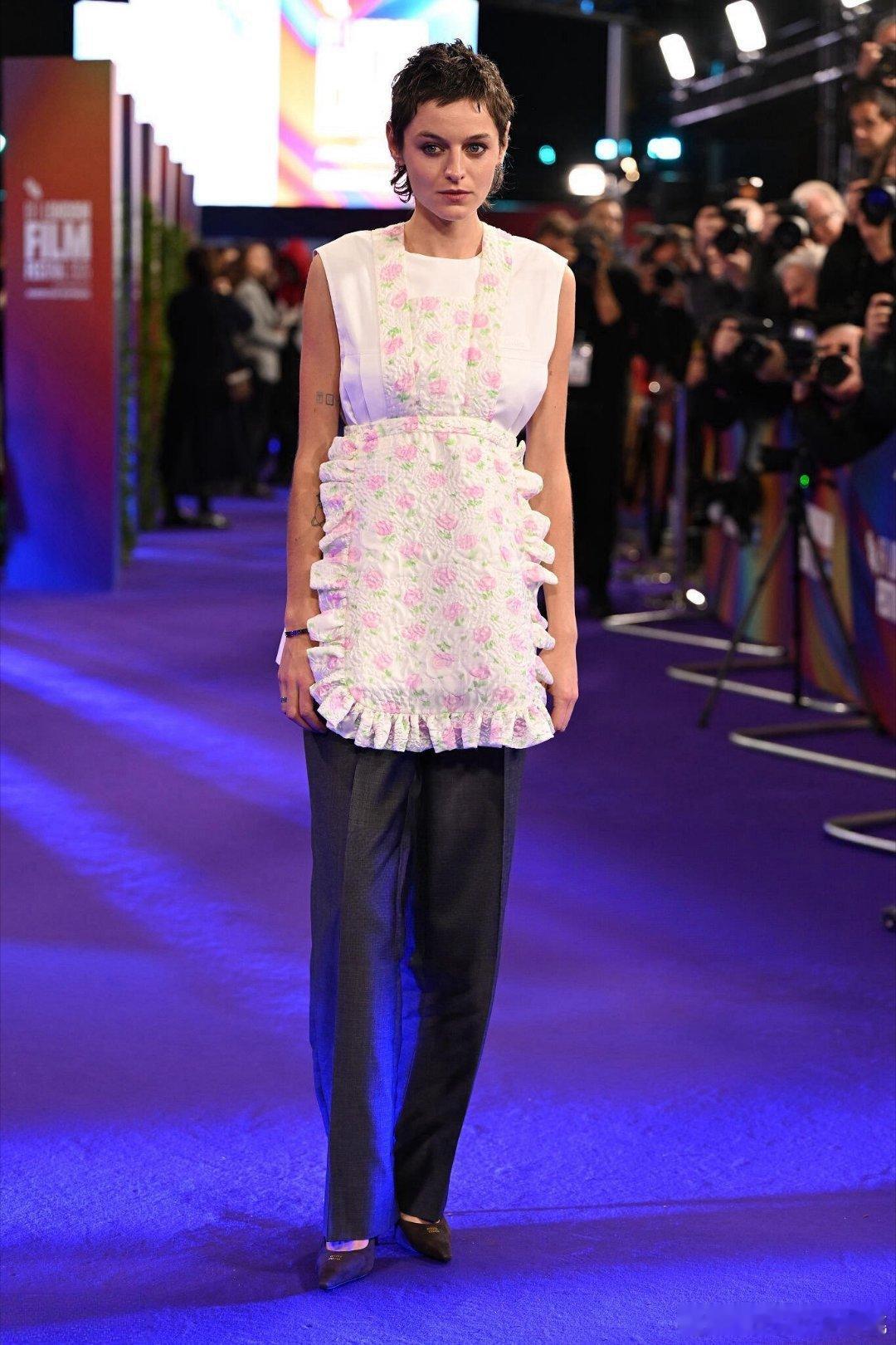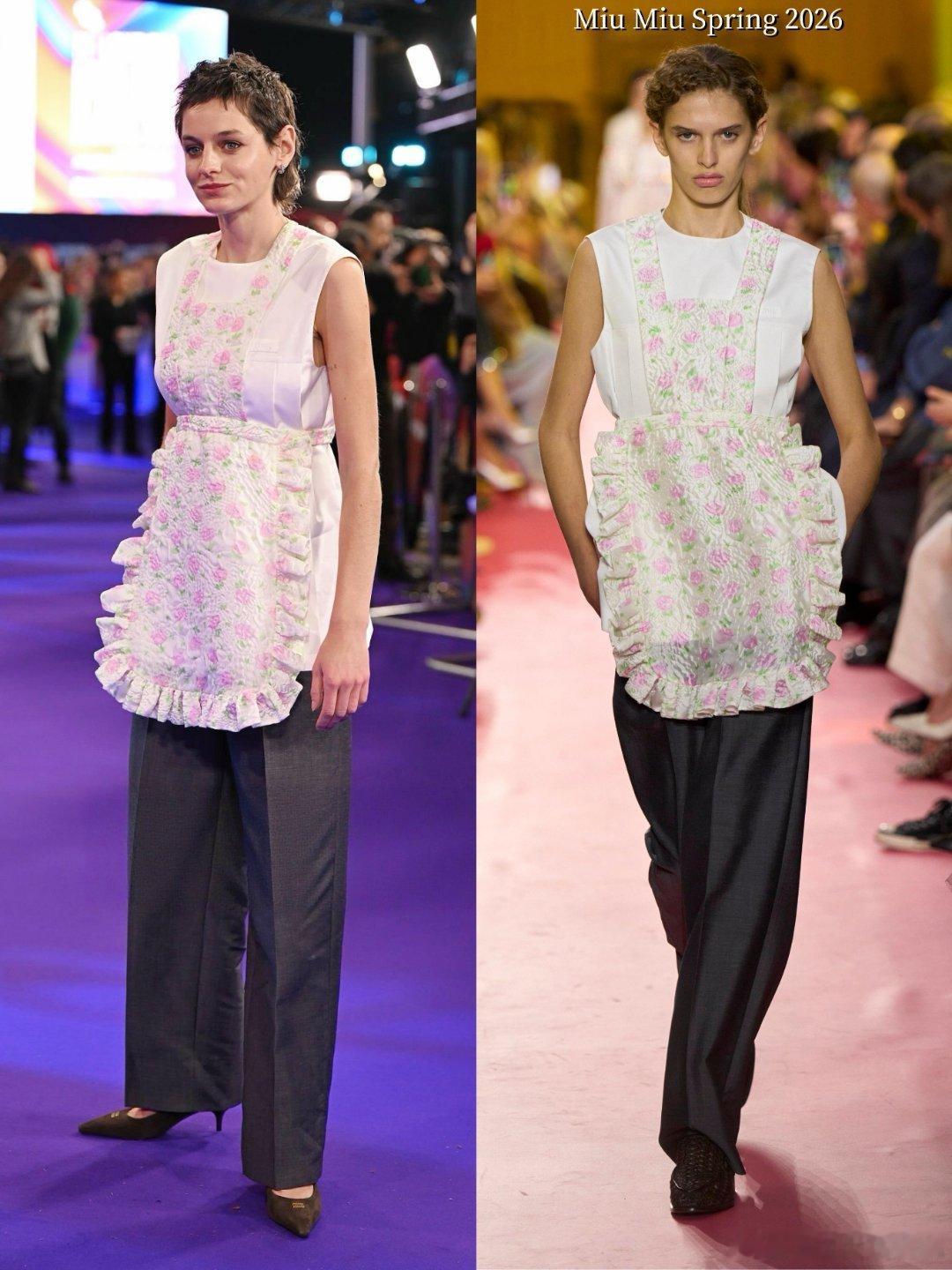 英国演员Emma Corrin亮相新片《英雄的一百夜》伦敦电影节首映礼,上身了刚在巴黎时装周发布的Miu Miu 2026春夏系列。时髦精秒变服务员哈哈哈哈哈