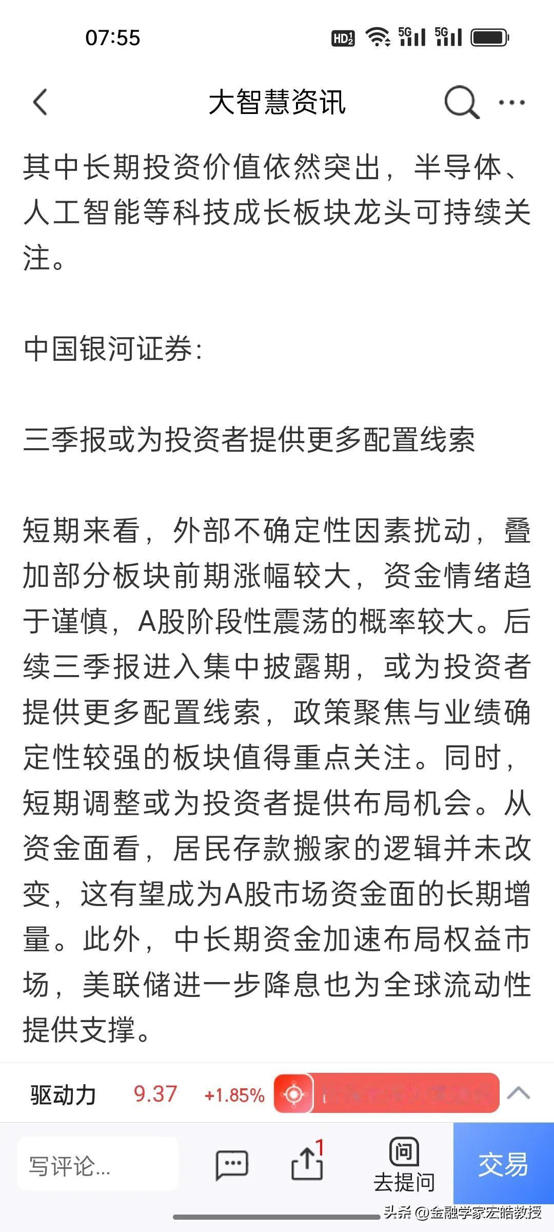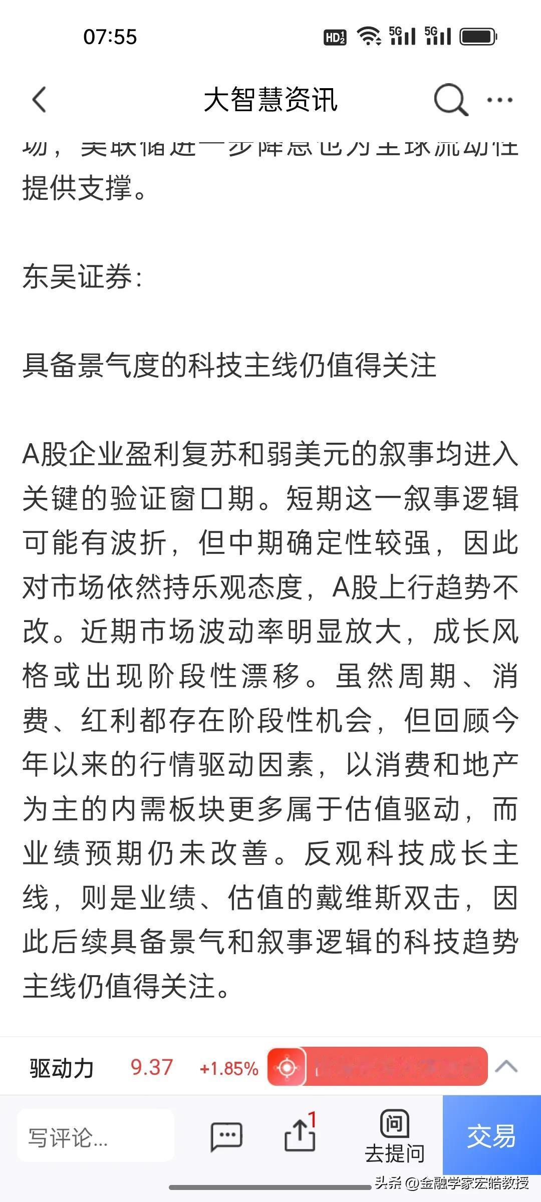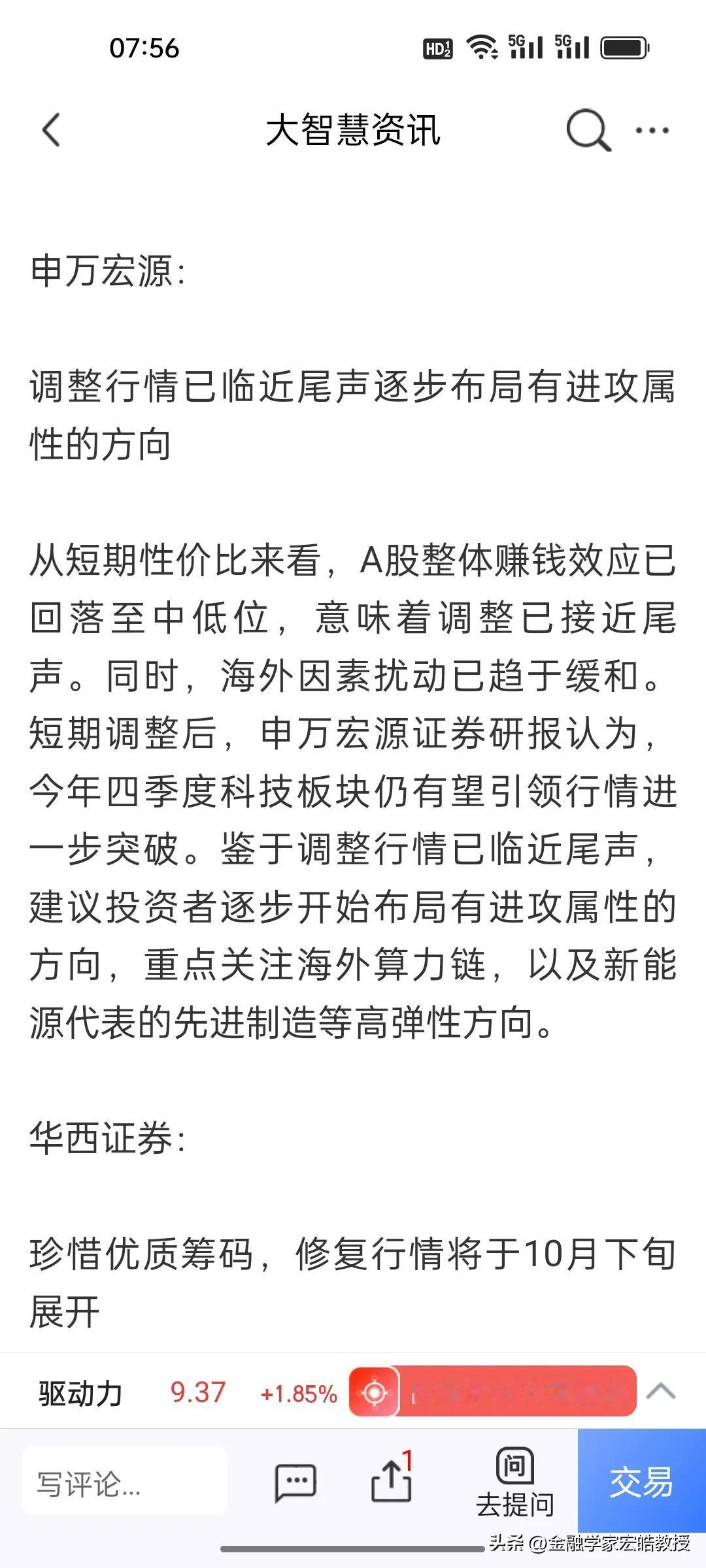 中信建投:目前还是牛市整理期,还没有结束。 今天开盘前,刚刚看到中信建投最新的研报,该报告认为,目前市场已经进入了牛市整理期,其特征就是指数横盘,缩量轮动。但是目前资金面宽裕,增量资金不断入场,新基金批量提前结募,因此指数下调幅度有限。 中信建投的这个预判我认为是比较客观的。目前对于短线的投资者来说,指数横盘操作难度确实在加大,板块轮动的速度比较快。如果短线追高,则很难赚钱。像算力,芯片这些热点板块,由于前期涨幅过大,目前都在回调整理。 此外,中信建投认为年底应该关注红利和科技。外资瑞银财富也是相同的观点,近期将中国科技股评级上调至最具吸引力。 另外,中信证券,中金公司,申万宏源,华西证券等券商近期的研报跟中信建投的观点一致,均认为短线回调属于上行趋势中的正常“颠簸”,不影响中长期走势,A股向上的大趋势并没有逆转。