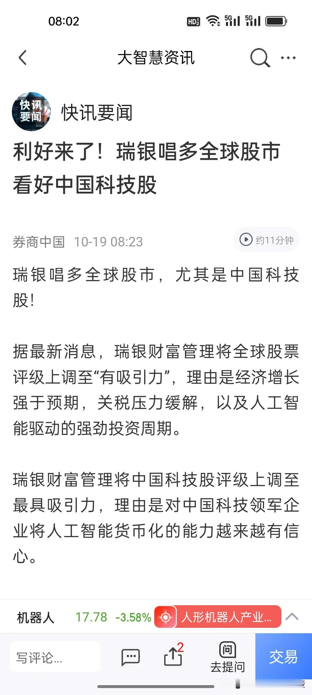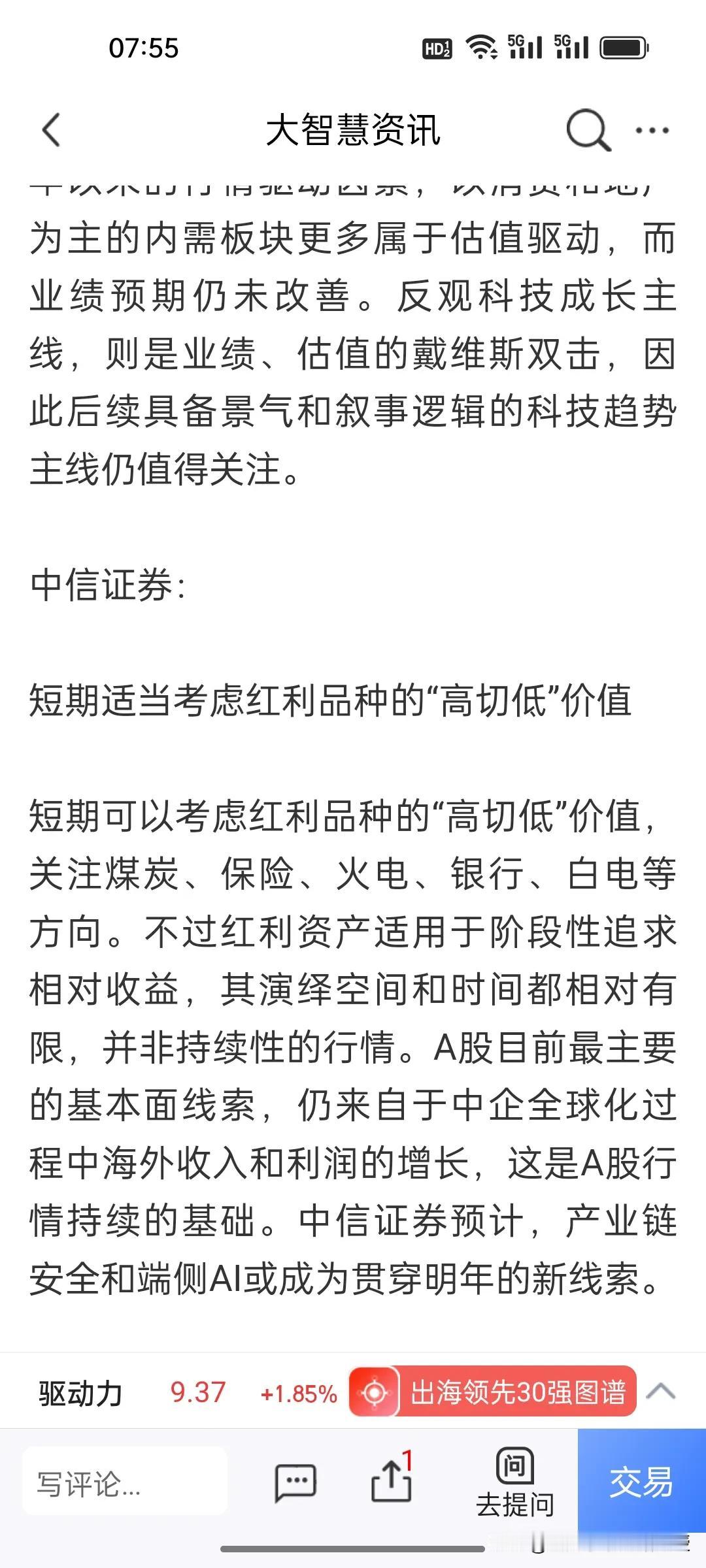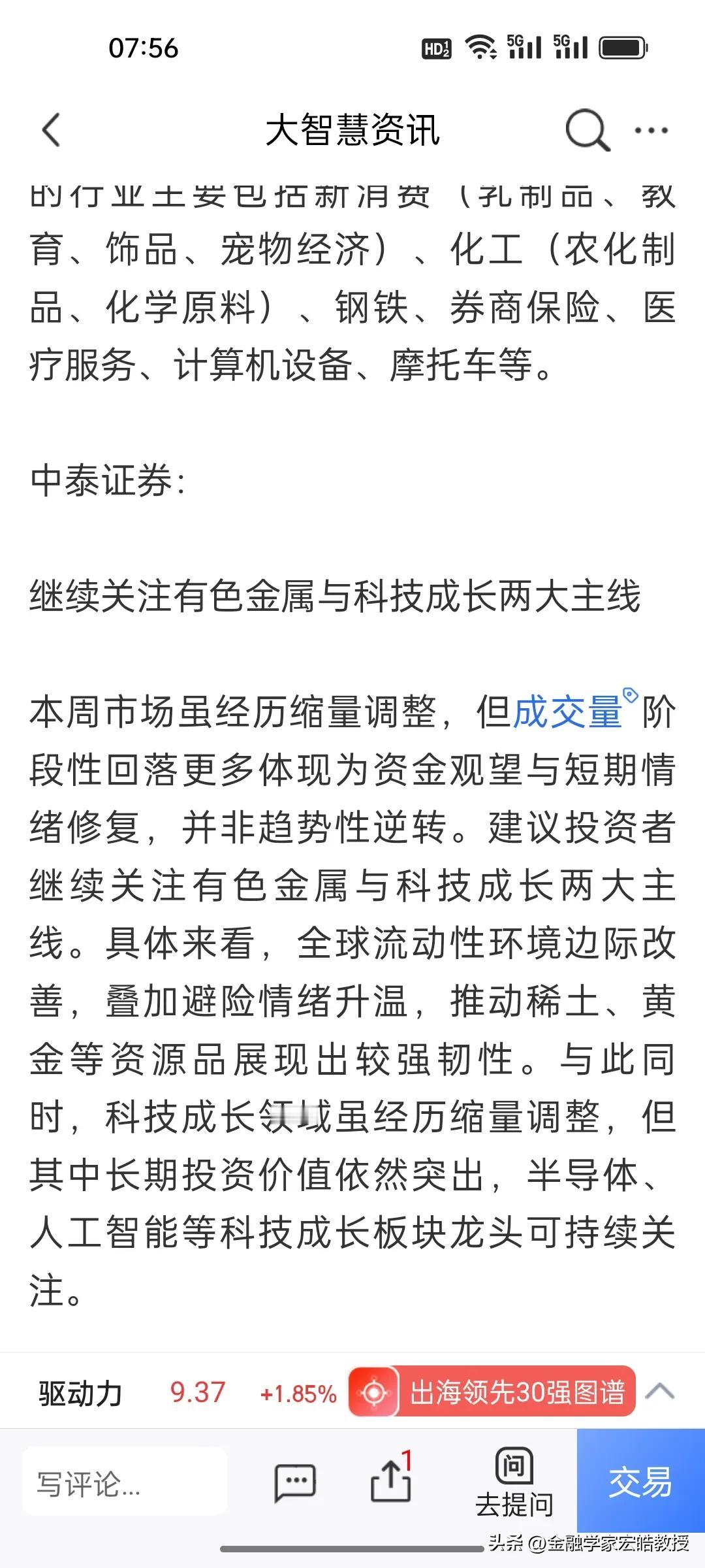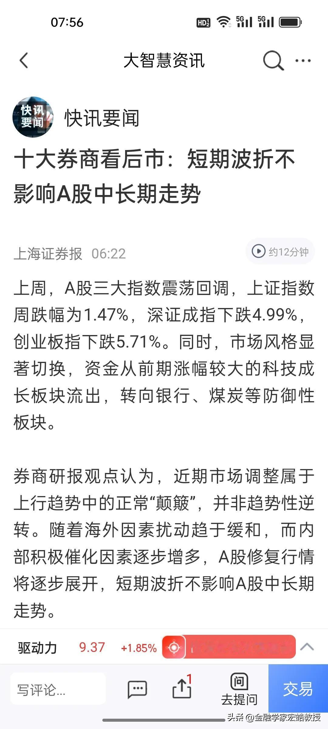 中信建投:目前还是牛市整理期,还没有结束。 今天开盘前,刚刚看到中信建投最新的研报,该报告认为,目前市场已经进入了牛市整理期,其特征就是指数横盘,缩量轮动。但是目前资金面宽裕,增量资金不断入场,新基金批量提前结募,因此指数下调幅度有限。 中信建投的这个预判我认为是比较客观的。目前对于短线的投资者来说,指数横盘操作难度确实在加大,板块轮动的速度比较快。如果短线追高,则很难赚钱。像算力,芯片这些热点板块,由于前期涨幅过大,目前都在回调整理。 此外,中信建投认为年底应该关注红利和科技。外资瑞银财富也是相同的观点,近期将中国科技股评级上调至最具吸引力。 另外,中信证券,中金公司,申万宏源,华西证券等券商近期的研报跟中信建投的观点一致,均认为短线回调属于上行趋势中的正常“颠簸”,不影响中长期走势,A股向上的大趋势并没有逆转。