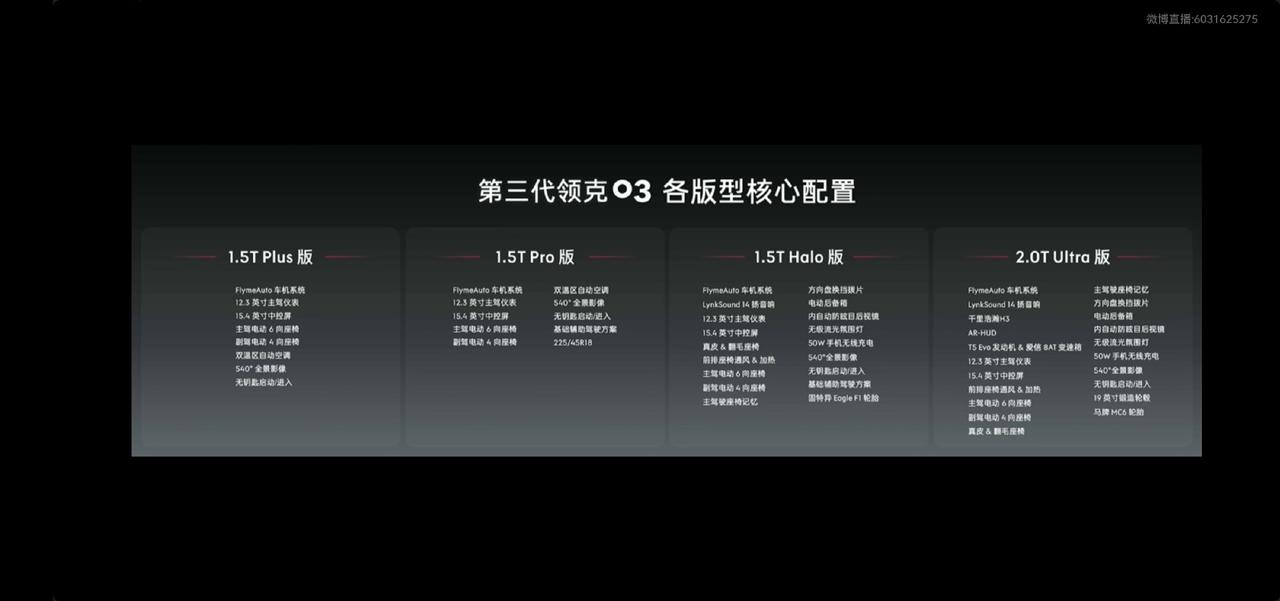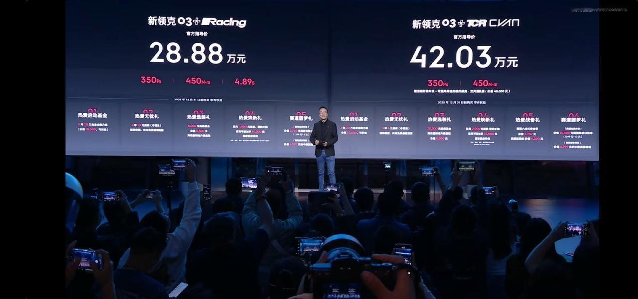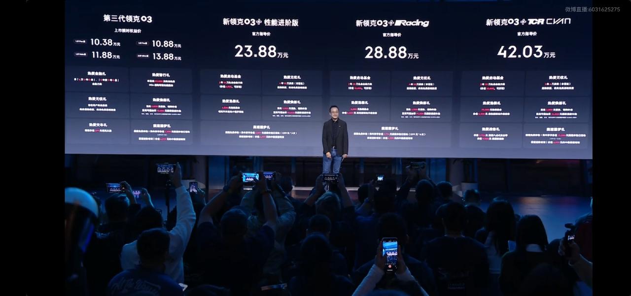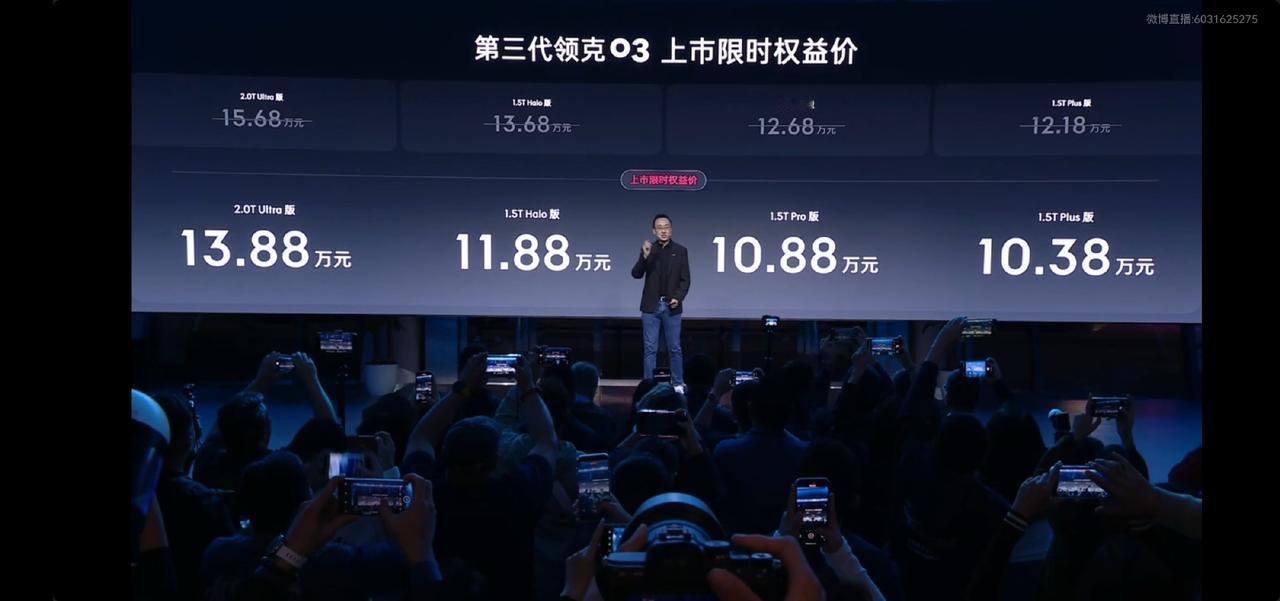 10.38-13.88万,领克03这价格满意了吗? 领克03/03+ 标准规格:4700*1843*1460mm,轴距2730mm(中型轿车) 驱动形式:汽油 发动机:1.5T/2.0T/2.0T(双增压) 变速箱:7DCT/8AT 驱动形式:前驱/四驱 油箱容积:50L 发电机功率:133-200kW/227-257kW 悬架系统:前麦弗逊后多连杆 最小离地间隙:146/132/112/114 零百加速:6.5s-4.89s 智驾系统:千里浩瀚H3 智驾芯片:J6M 智驾硬件:3毫米波/12超声波/11摄像头 座舱系统:Flyme Auto/领克OS N 座舱芯片:龙鹰一号/高通8155 屏幕:12.3液晶仪表+15.4娱乐屏+25.6AR-HUD 颜色:外银/紫/黑/白/灰,内红/白/黑 轮胎:17/18/19寸 扬声器:8扬/14扬/哈曼10扬 座椅:一体运动座椅 其他配置:540影像、50W快充、小蓝灯 领克03 10.38万 1.5T Plus 4摄像头+4超声波+CC定速巡航 17寸轮毂、8扬声器、皮方向盘/座椅、主副驾电调、运动尾翼 10.88万 1.5T Pro 1+4摄像头+3毫米波+8超声波、前泊车雷达 18寸轮毂、前排座椅通风加热、 11.88万 1.5T Halo 主副驾座椅记忆、自动远近光大灯、后排私隐玻璃、电尾门、驭风尾翼 领克之声14扬、流光氛围灯、真皮方向盘/座椅、换挡拨片 13.88万2.0T Ultra 千里浩瀚H3、AR-HUD 19寸锻造轮毂、撞色车顶 领克03+ 23.88万 性能进阶版 高快领航、自动智能大灯、全景天窗、可调碳纤尾翼、双边双出排气、排气声浪 哈曼10扬、8155芯片、19锻造轮毂 Alcantara真皮+翻毛皮电动座椅、四驱、Akebono四活塞卡钳、245/35 R19轮胎/轮毂 28.88万 Racing版(1878宽,1450高) 无自动智能大灯系统、无全景天窗、可调阻尼减震器、CC定速巡航 ZR19 米其林PS4轮胎 42.03万 TCR版(1877宽,1446高) 前驱+E-LSD、米其林CUP2轮胎 织物赛化座椅、赛道熏黑排气 选装: 科技升级包(千里浩瀚H3+AR-HUD) 运动升级包(碳纤尾翼) 白内饰(皮质) 红内饰(翻毛皮+皮) 宽体选装包(03+限定) 碳纤维空气动力学套件(TCR版) 购车礼: 2000元置换补贴 1.5万报废补贴 送299元头盔 送2次免费赛道体验 教授觉得普通03的话,直接买顶配就足够了,其他配置根本不用考虑,但是预算不足的话,那就10.88的次顶配,也算是入门了。03+的话按需选择,喜欢哪款看配置就可以了,性价比也是很高的。【来自懂车帝车友圈】