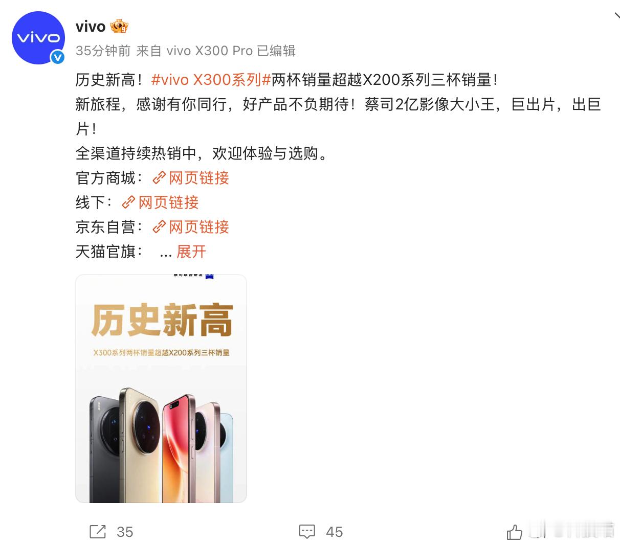 历史新高!vivo X300系列两杯销量超越X200系列三杯销量!