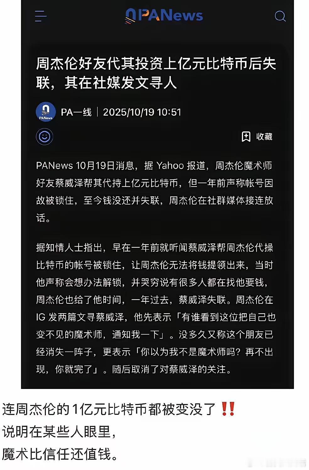 昔日魔术搭档蔡威泽,如今成了他社交平台上的“失踪人口”。1.2亿台币的纠纷,既非借款,也非投资,而是一场以信任为赌注的豪赌:蔡威泽承诺项目上线,周杰伦信了那句“没上线我个人买走”。没有合同,没有协议,只有一句“我懂你”。