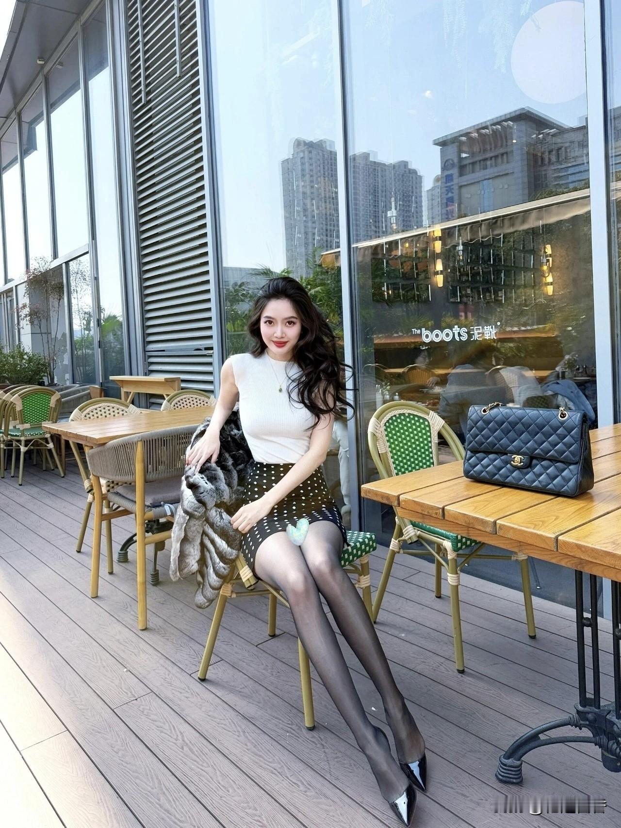 白点黑色短裙搭配白色短袖,时尚简约大气超显气质!