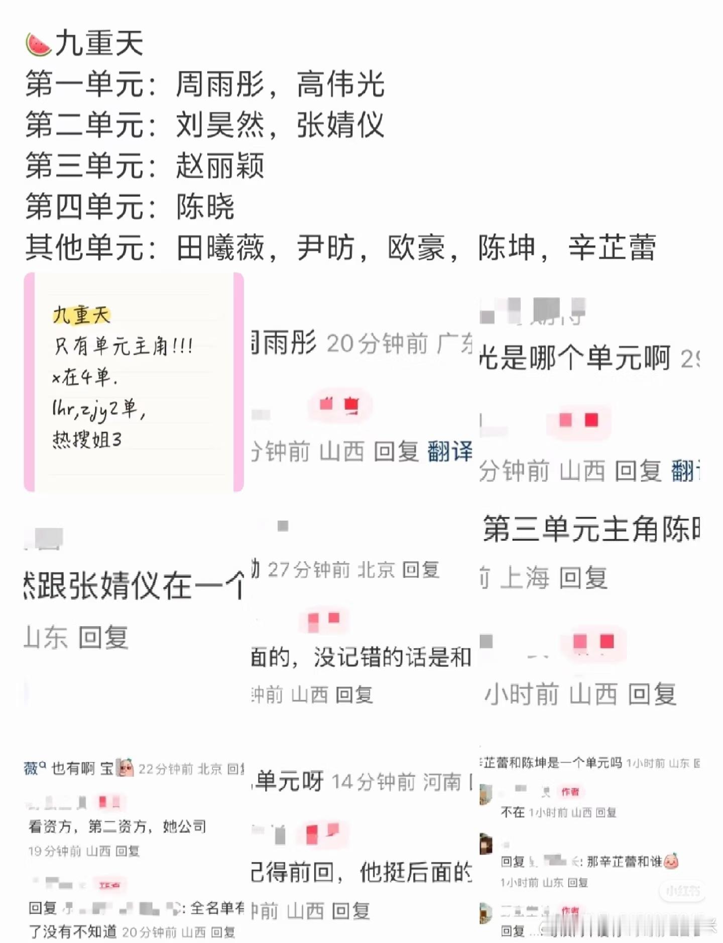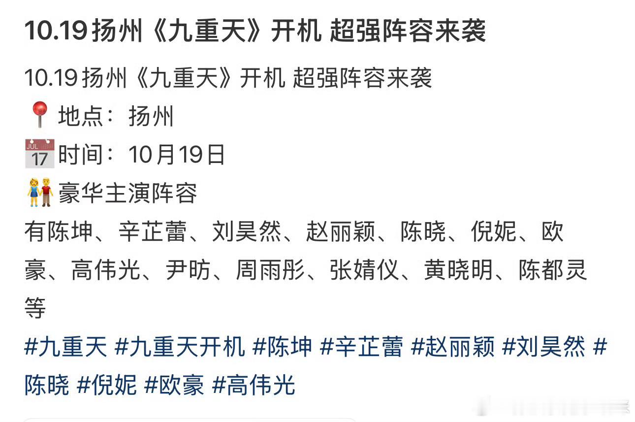 《九重天》这么大的卡司阵容,就这么悄咪咪开机啦?单元剧,所以陈晓和赵丽颖在一部剧里也应该不会有对手戏,应该合作不到。唉