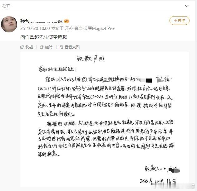 任嘉伦黑粉手写道歉信发博致歉了,任国超同志对待黑粉一直挺刚的,铁腕手段硬刚到底,