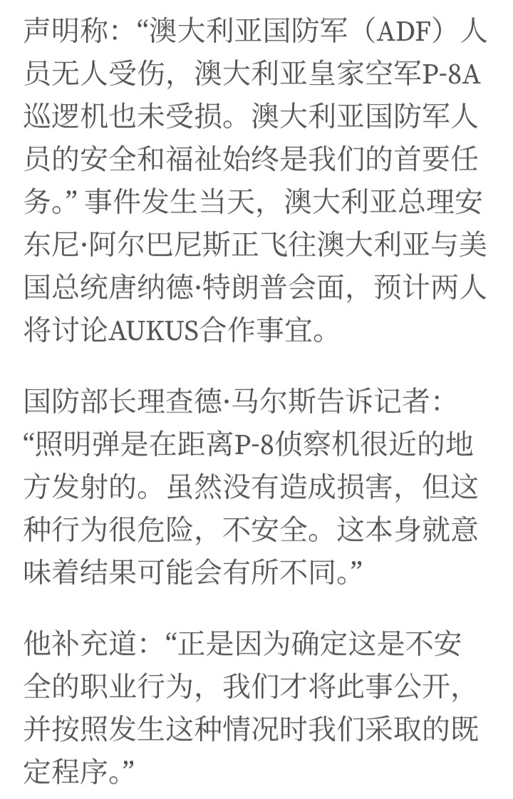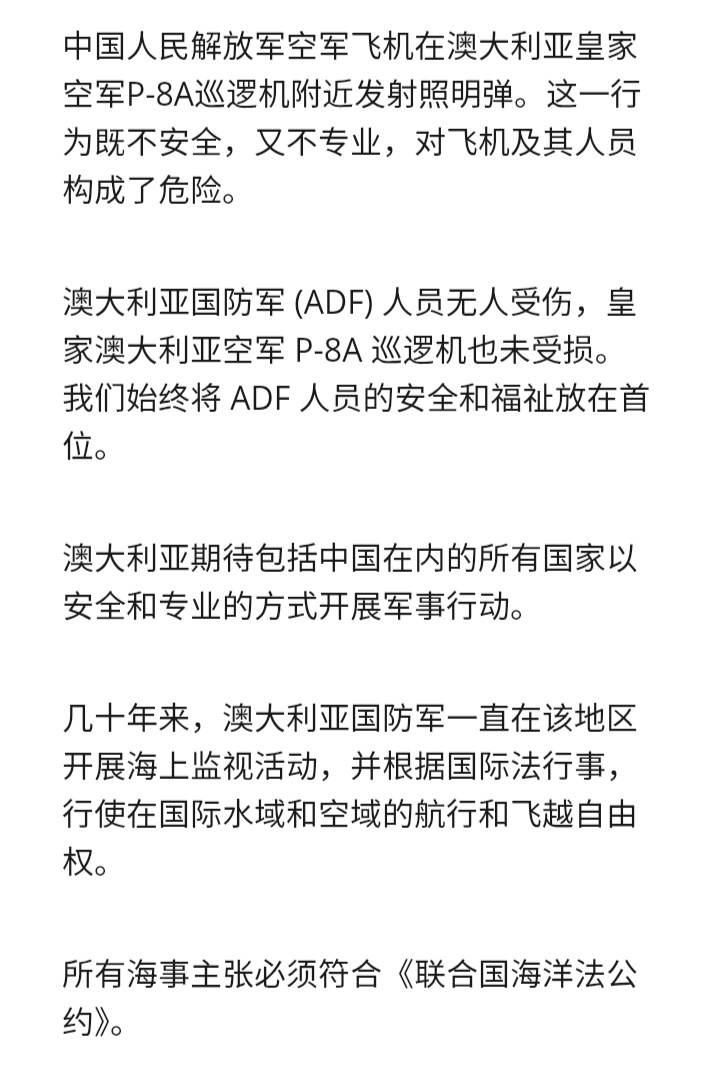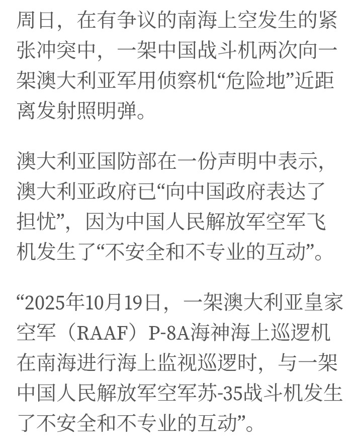 烽火问鼎计划澳大利亚国防部发布声明称,上周日(19日),在南海上空一架中国空军苏-35战斗机两次向一架澳大利亚空军P-8A巡逻机近距离发射照明弹。