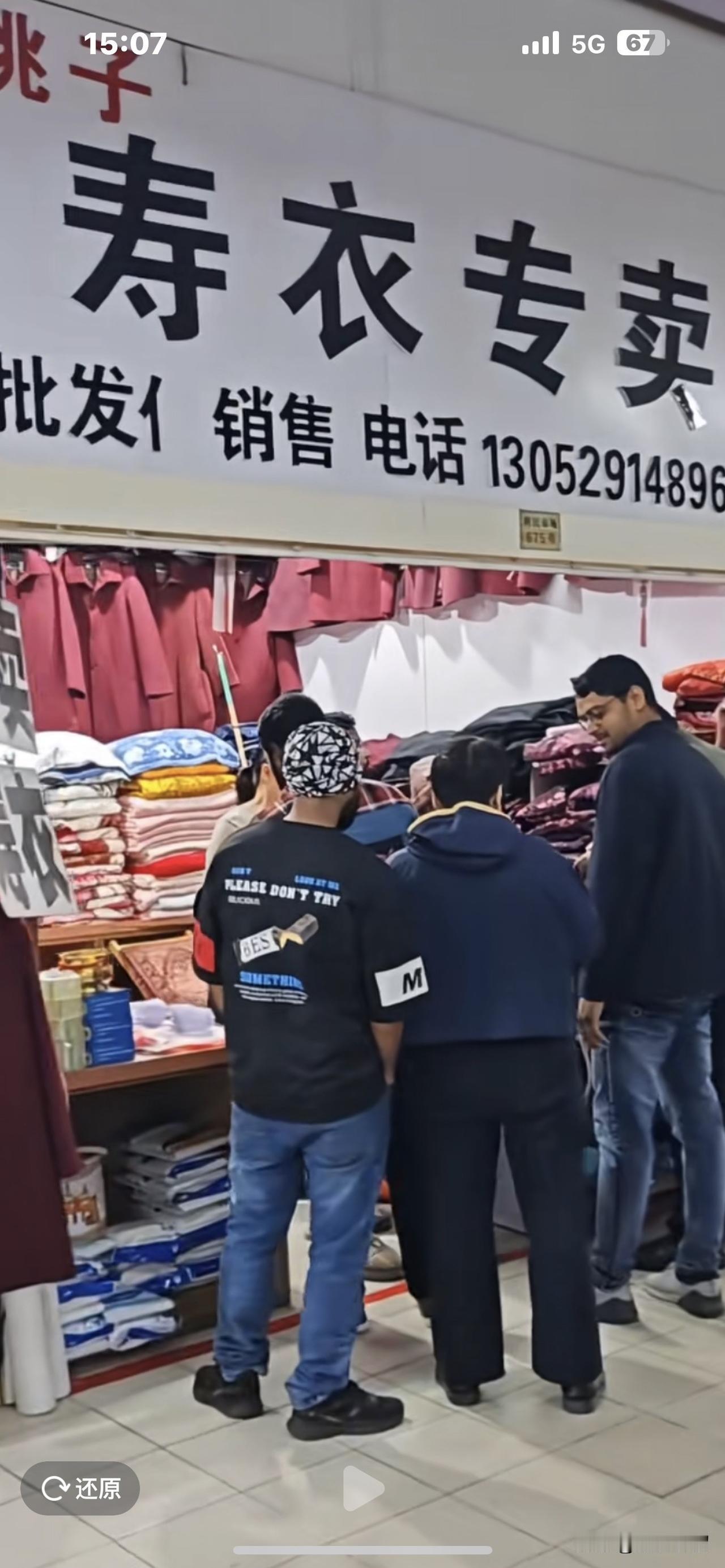 笑死了! 一位阿姨在江苏镇江开了家寿衣店。10月20日,阿姨店里来了一群老外,看到阿姨店里的寿衣,老外两眼放光,非要买阿姨店里的寿衣,估计把这金闪闪的寿衣看作是唐装了。阿姨不太会说英文,便告知他们这个衣服不卖。可老外不依,以为阿姨要涨价。阿姨费尽口舌,四个老外总算答应不买寿衣了,转而每人买了阿姨店里的一顶帽子(就是正常人能戴的那种)。25一顶的帽子,阿姨每顶只收了15元。 不得不说,这位阿姨真是良心卖家,咱不能因外国友人不了解中国文化,就看他们闹笑话。 这个阿姨也真的是给咱中国人长脸了! (图片来源网络)