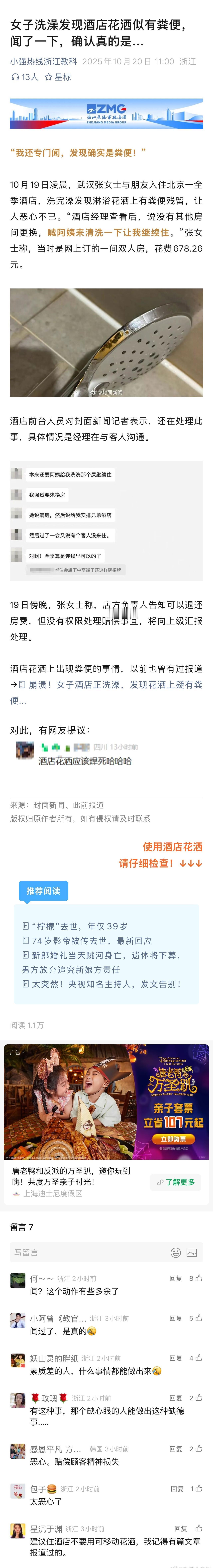 女子洗澡发现酒店花洒似有粪便 还闻了一下,确认真的是… 闻了一下,我自己洗头经常