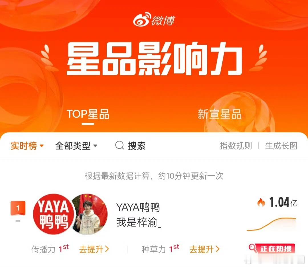 梓渝✘鸭鸭TOP星品影响力热度值破亿!!破亿是啥概念?不太懂[笑cry]