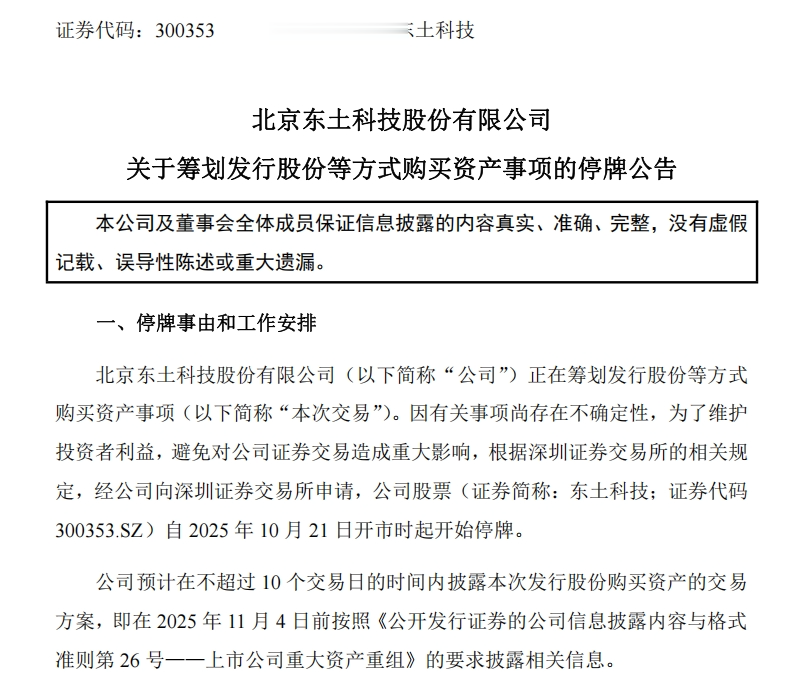 东土科技公告称,公司预计在不超过10个交易日的时间内披露本次发行股份购买资产的交易方案,即在2025年11月4日前按照《公开发行证券的公司信息披露内容与格式准则第26号——上市公司重大资产重组》的要求披露相关信息。