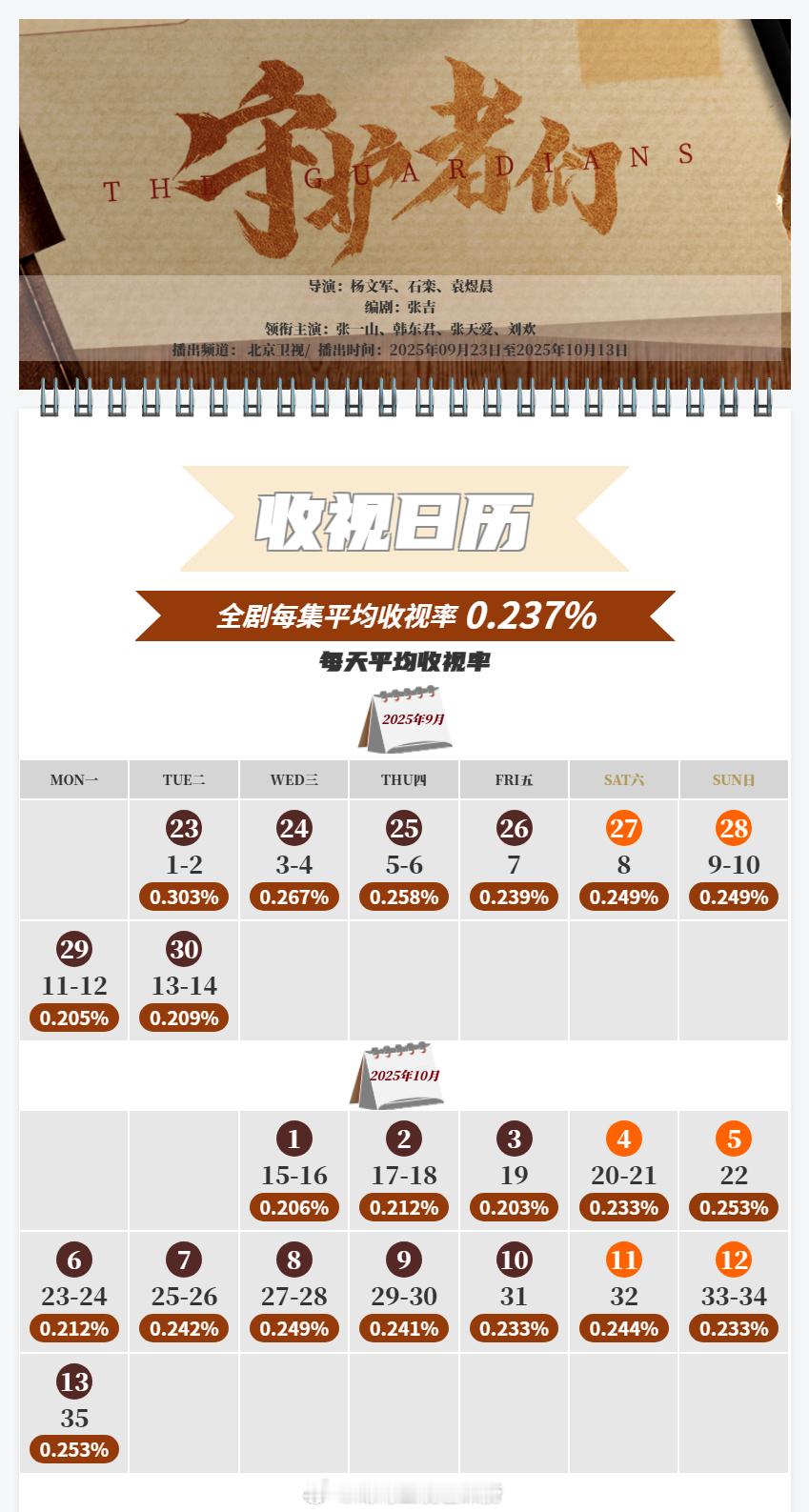 张一山 / 韩东君 / 张天爱 / 刘欢 守护者们 平均收视率0.237%,最高单日0.303%