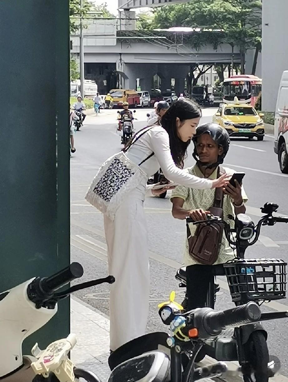 三元里现状,这个美女也真是单纯! 在三元里街头,穿白裙的美女弯腰给骑电动车的外籍男子指点手机,那热心劲儿看得人又暖又慌。有人说她单纯善良,可也有人炸了:“这地方鱼龙混杂,不怕是套路吗?” 三元里的涉外故事向来不少,好心助人是美德,但防人之心也不能无啊。可反过来想,要是人人都揣着戒备,那善意岂不是成了奢侈品? 你觉得这姑娘是善良勇敢,还是单纯天真?